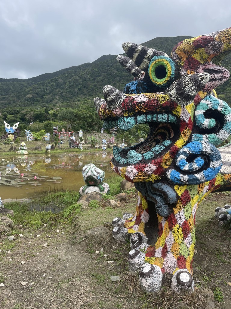 Next up is Yoneko Yaki Kobo Shisa Farm. Shisa are the dragon statues set up on top of every traditional Okinawan house, which are said to protect the inhabitants. On the farm, an artist created giant, colourful versions of them. Set against the green scenery, it’s truly a special sight. From here we continue the journey north to Sunset Beach and our final sightseeing destination: the Hirakubozaki Lighthouse all the way up north. On the way back south to the guesthouse, we notice that the east coast is way less populated. We take advantage of the empty roads to snap some pictures of the beautiful sunset. And just before we arrive back in Ishigaki, Julie spots a turtle crawling out of the bushes onto the road. I stop the car, she runs out and grabs the small animal by its shell to return it to the mangroves. By now, we’re one with nature.