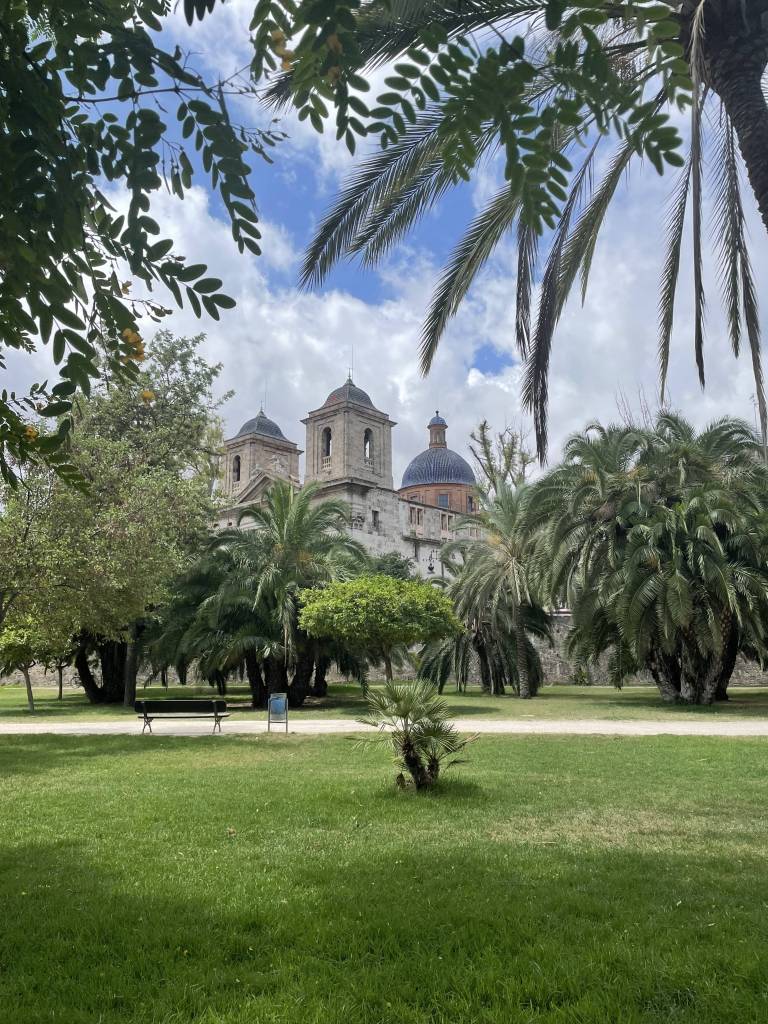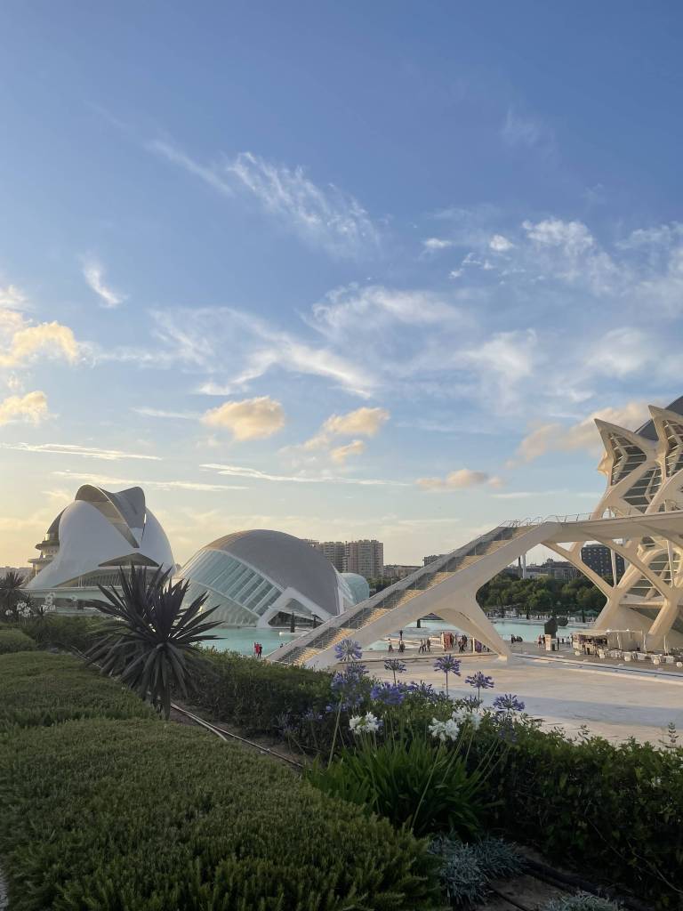 the green spaces: In an attempt to keep cool on a particularly hot summer day, I venture to the Jardin del Turia. The more than 9 kilometers long park spans across the drained bed of the river Turia from Parque de Cabecera all the way to the city’s main sight: Ciudad de las Artes y Ciencias. I walk in the shade of trees and arched bridges and take breaks on some widely available benches surrounding small ponds. As I arrive at the very modern arts and culture complex hosts various museums and event spaces including a renowned concert hall. Not in the mood for scientific education, I admire the impressive architecture from the outside and marvel at the pretty sunset turning the sky all shades of orange and pink.