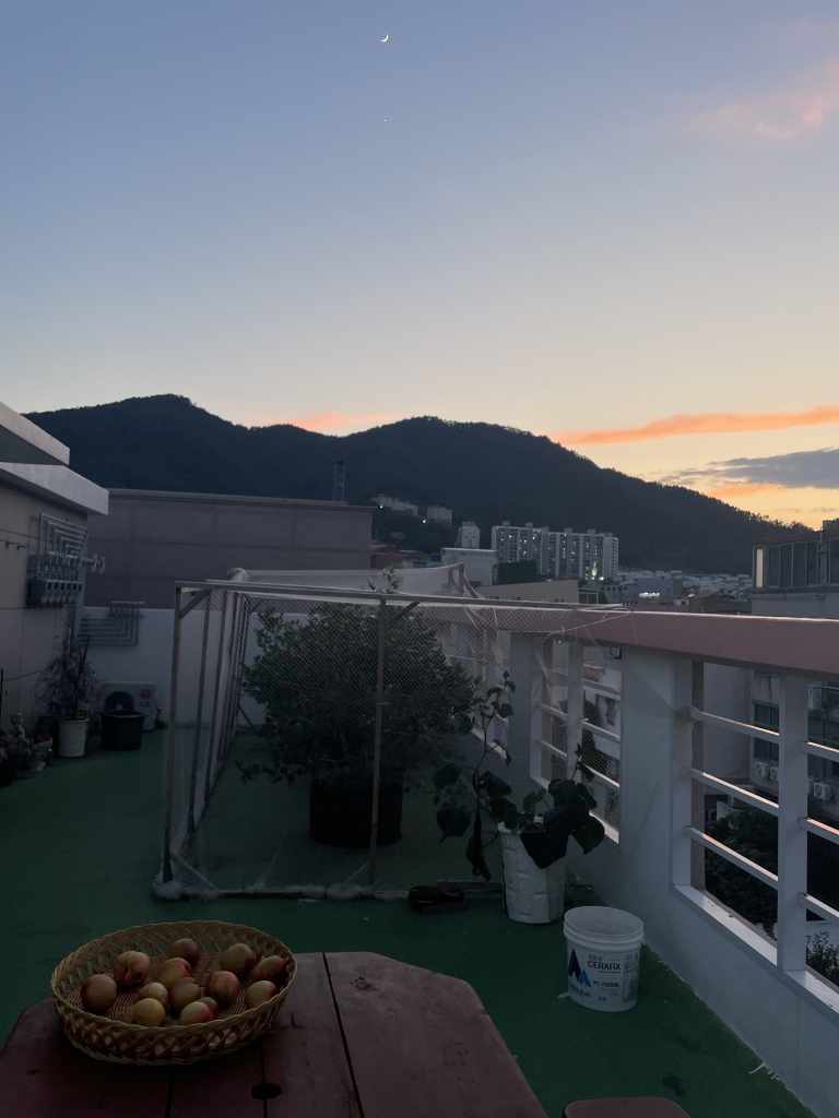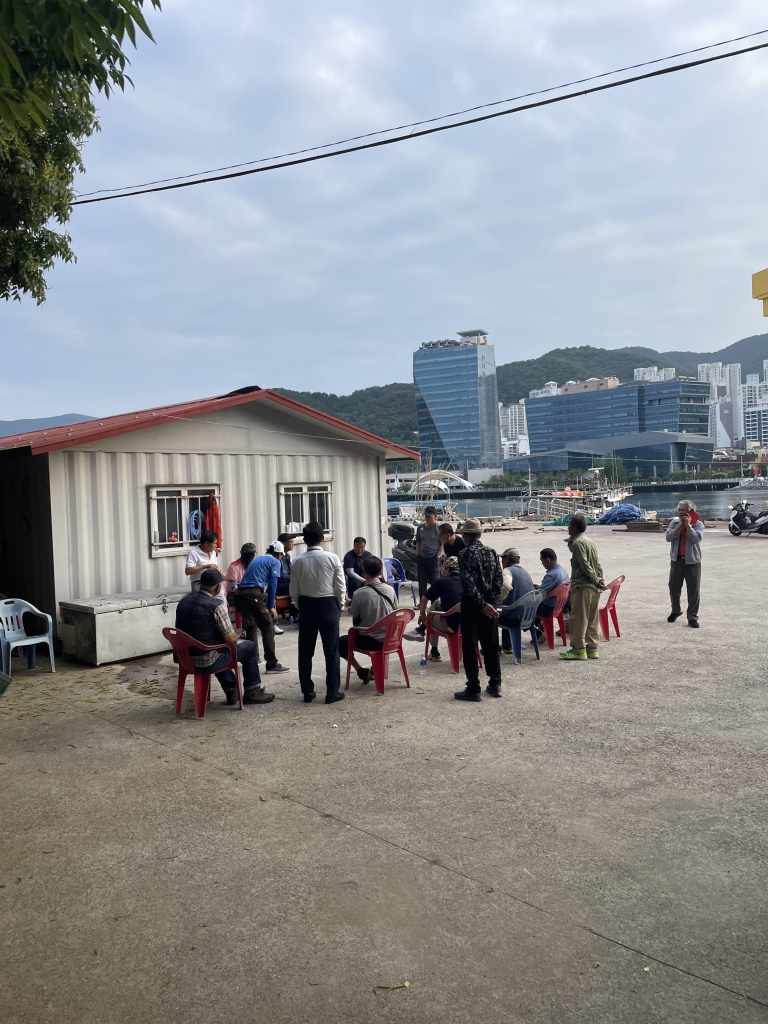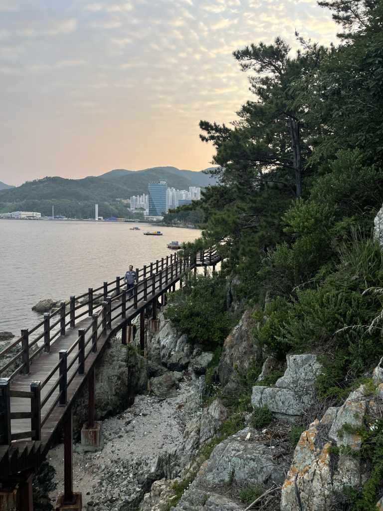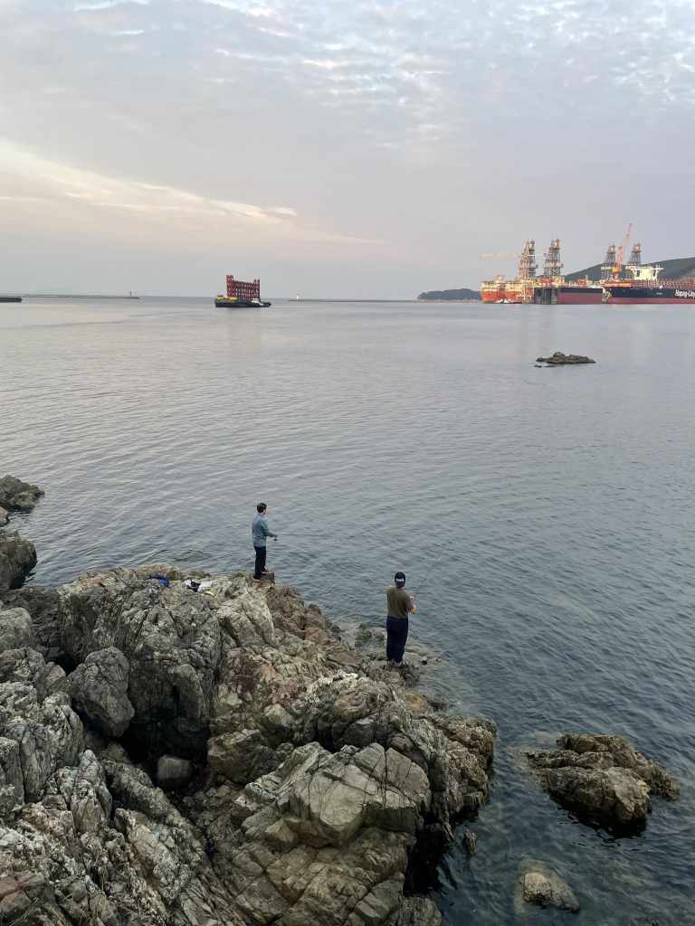 I quickly fall into a routine of work, making lunch, more work, and ending the day with a walk to the fishing harbor and the coastal park. Listening to a podcast, I venture down the wooden walkway over the rocky cliffs shortly before sunset. The stark contrast between the deep blue water, the lush green hill, and the giant container ships in the shipyard on the other side of the bay is captivating. No wonder there are lots of people coming here every night. The crowd consists of mostly older Korean couples in fancy workout clothes, but young men on a run and local fishermen too. Sometimes I bring my bento box and eat dinner at the waterfront.