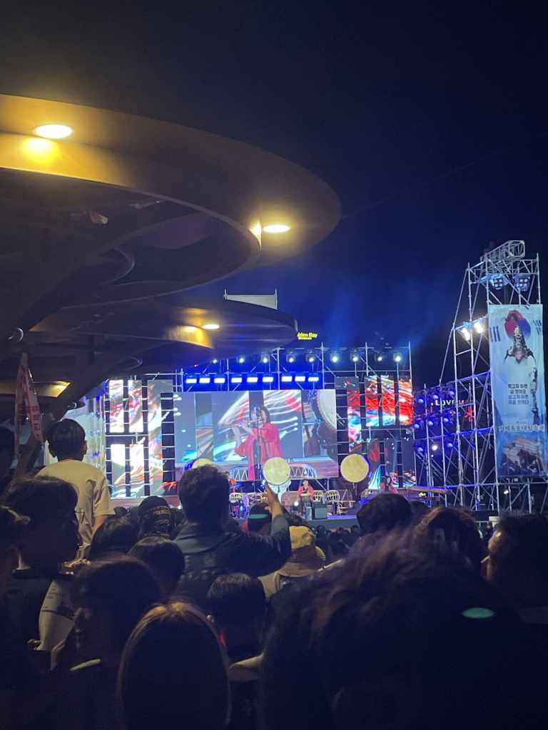 After so much unexpected information about the island, I totally forget to ask them more about the upcoming festival. When we return to the now bustling waterfront park, our ways part. After helping myself to a flyer with the event timetable, I join the crowd gathered in front of a large screen. I arrive just in time to see a lady wearing a Hanbok – the traditional Korean dress – step on the stage. I don’t understand much of her speech, but the crowd seems to be excited. As soon as the lady disappears backstage, a group of traditional Korean drummers set up their instruments on the stage. Their performance and the racing beats are captivating! Just like the singer who is closing this opening ceremony with a nostalgic love song.