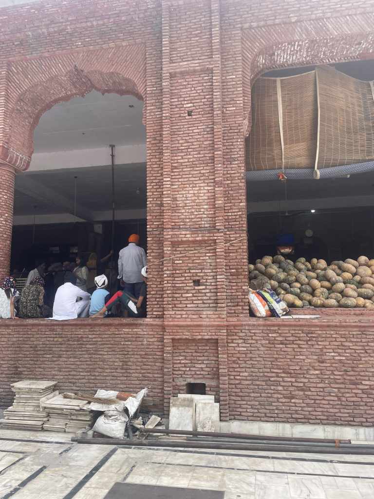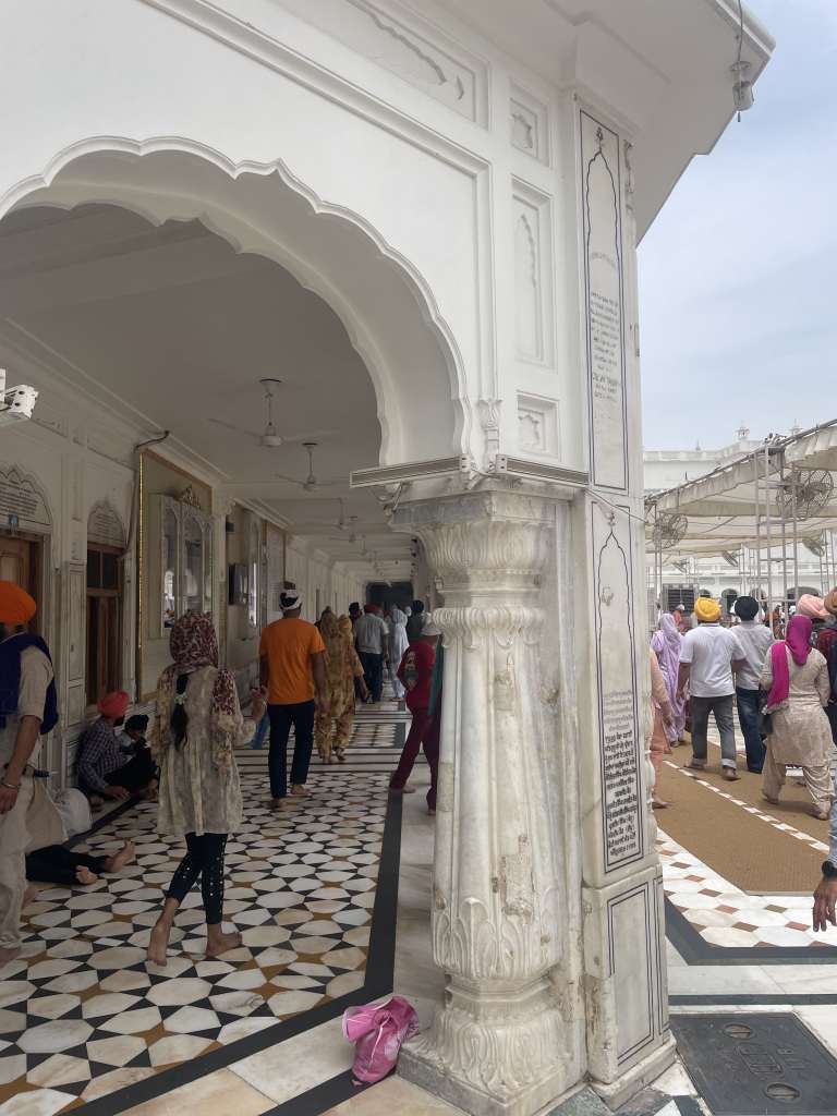 Meanwhile, the 2 girls sat down just outside the musician’s room. I contemplate joining them for a little while but then decide to continue my exploration. So I say goodbye and walk back across the narrow bridge towards the exit. A kind man offers me some of the blessed rice at the gate to the main temple grounds. But again, as a mere visitor, it doesn’t seem right to accept it. Instead, I take another sip of my water bottle and proceed to circumnavigate the pond one more time. After having just experienced so much kindness from the Sikh people in the queue and gotten an image of the musicians, the music feels even more soothing than before. The serenity of the place despite the large number of visitors is truly impressive. Now I can understand the pilgrims who are taking a rest in the shade under the arcades before continuing their prayers. Worshipers may even stay at the temple halls for a few nights for free. It’s open 24 hours a day and several people encourage me to return at different times of the day because the different sunlight changes the atmosphere.