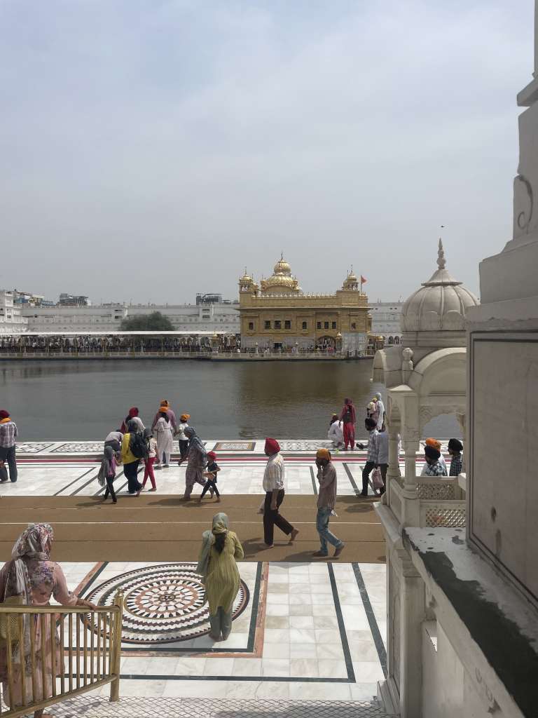 The gate with its golden dome is just a light version of what awaits me inside. But when I get closer to the entrance, I realize that I leave my shoes somewhere and find a piece of fabric to cover my hair with before the guards will let me enter. I quickly find the sign leading to the general shoe storage space. With 20‘000 visitors a day I can only hope that the system works well enough to have the correct shoes returned later. With bare feet I return to the guarded entrance. Before I cross the small stream of water between me and the and the marble stairs, I wrap my own pink bandana around my head. Next to me an Indian family is covering their kids‘ heads in some of the orange ones with the temple’s icon which are available for free. I walk past them through the refreshing water and up the steps where a Sikh guard with a speer inspects my bag. He lets me pass and I finally enter the temple grounds.
