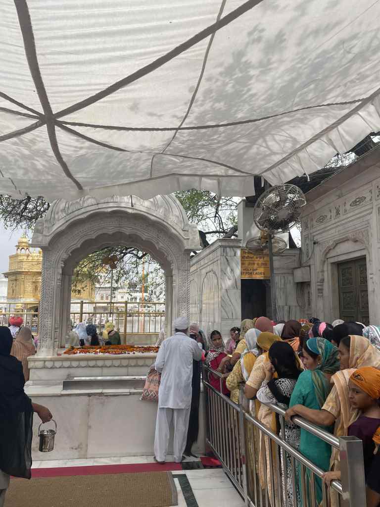 There are few signs suggesting walking slowly and be aware of the people in front of you. For Sikh people this is the holyest place in the world and some may stop aprubtly at the sight of the golden temple and bow down to the floor. In awe of the sparkling marble and architecture, I begin my circuit around the large pond in clockwise direction. I take my time to absorb all that is going on and to figure out the rituals in the Sikh religion, which I don’t know much about. I soon notice the men in turbans undressing at any given place along the water and taking a dip in the holy water. My silent question if women are allowed to bathe too is soon answered. There is a separate area protecting women and girls from other visitor’s view. Judging by the queue outside it, it doesn‘t seem too spacious. While they wait in line, I continue my walk to the Langar. This is deemed the world’s largest community kitchen, serving between 50‘000 and 100‘000 meals a day to any hungry person 24 hours a day. Regardless of religion, caste, gender, or economic status, anyone is welcome, and I briefly regret having eaten just before my visit.