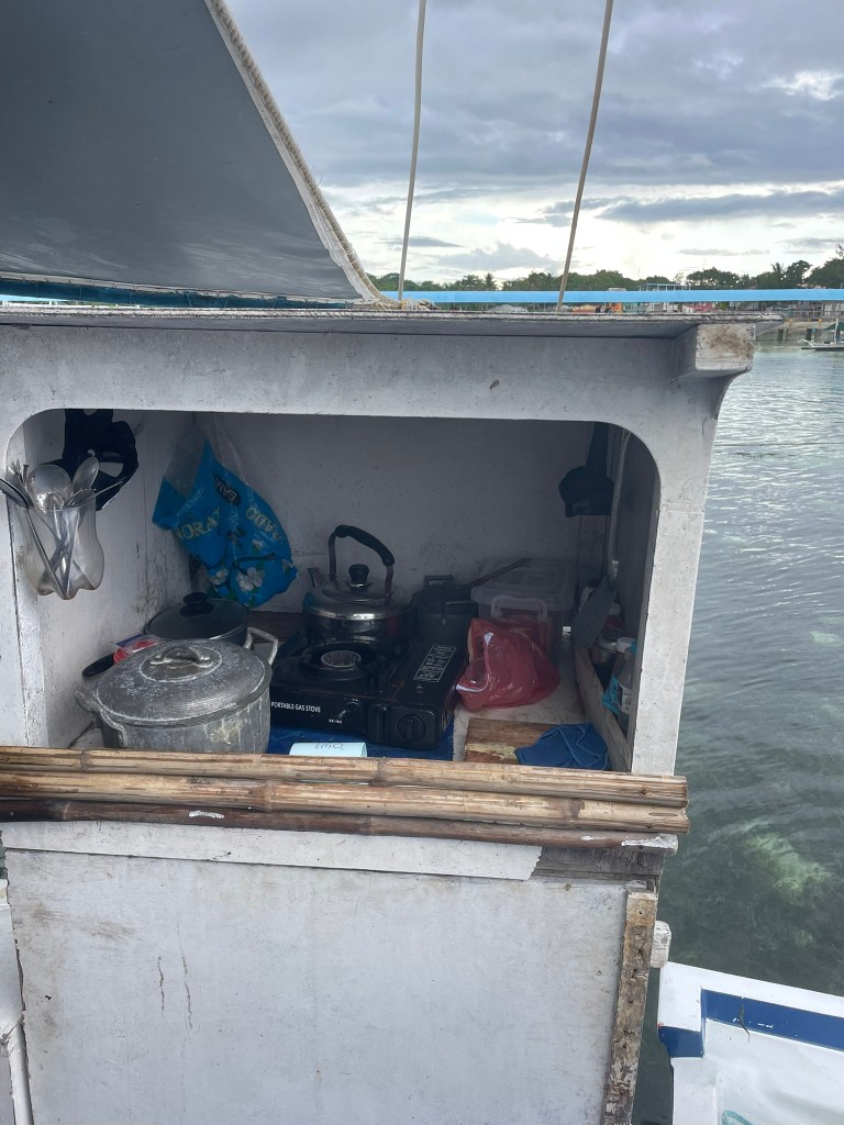 At least, it seems to be the same for the rest of the group. The French guy even got stung on his upper lip. The shop manager is quick to pass around a bottle of rubbing alcohol, which is an effective remedy to stop the itching. When a British girl asks about the myth of using human urine to treat jellyfish burns, he answers the joking Philippine way: “It does work, but with the burns on your neck you might want to reconsider this option.” With about 40 minutes left before the second dive in the same spot, I decide to sit in the front of the boat to eat the snacks I brought. Just when Felix joins, everyone on the boat next to ours suddenly exclaims excitedly.