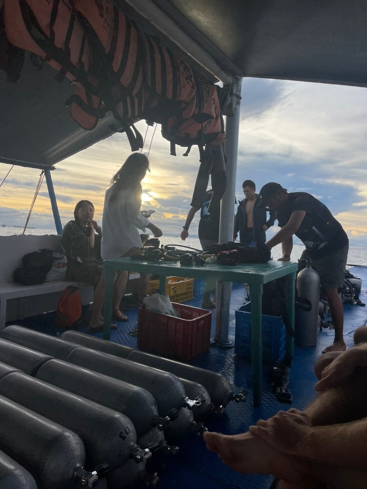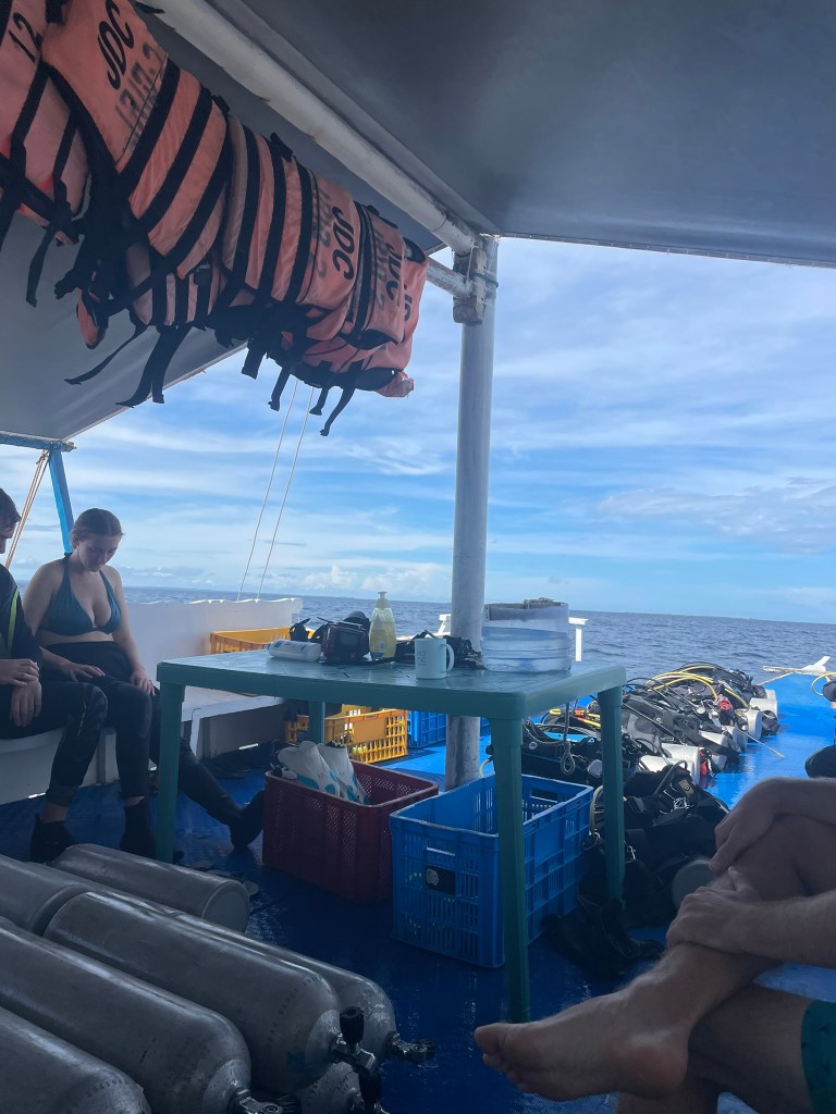 Then the guide signs that it’s time to head up. A solitary thresher shark sees us off while we slowly ascend along the mooring line to the 5-meter mark. Here we hover for our 3-minute safety stop and practice making bubble rings to pass the time. When we finally surface close to the boat, I quickly realize that the jellyfish must have stayed in the area, because my neck immediately starts to itch as soon as I get back on deck. The crew helps all of us with taking off our BCD, and we store the equipment in the designated boxes for the surface interval. I sit down on a bench and can’t help but scratch my neck and ankle.