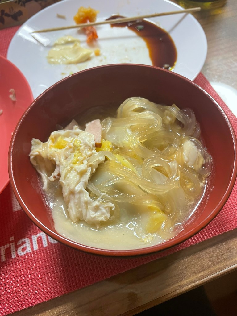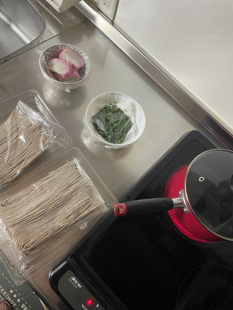 With most of my friends in Kanazawa leaving for trips abroad and to Tokyo, I’m happy when one of my roommates shares her plan to have a typical Soba dinner in the sharehouse group chat. 1 other girl and I accept the invitation to join, and we finally get together in the kitchen at around 6pm. On the TV in the living room, the singing contest “Kōhaku Uta Gassen” is already playing. Kiko just returned with fresh Soba, while Marie brought a big plate of discounted sushi and Shrimp Tempura from the supermarket. I complete the spread with a bottle of sparkling wine when Rin-san, the owner of the house we’re living in, stops by with fried chicken, yakitori, and Chinese oyster pancakes. He’s happy to see we’re celebrating together and tells us to enjoy the extra dishes from his restaurant.