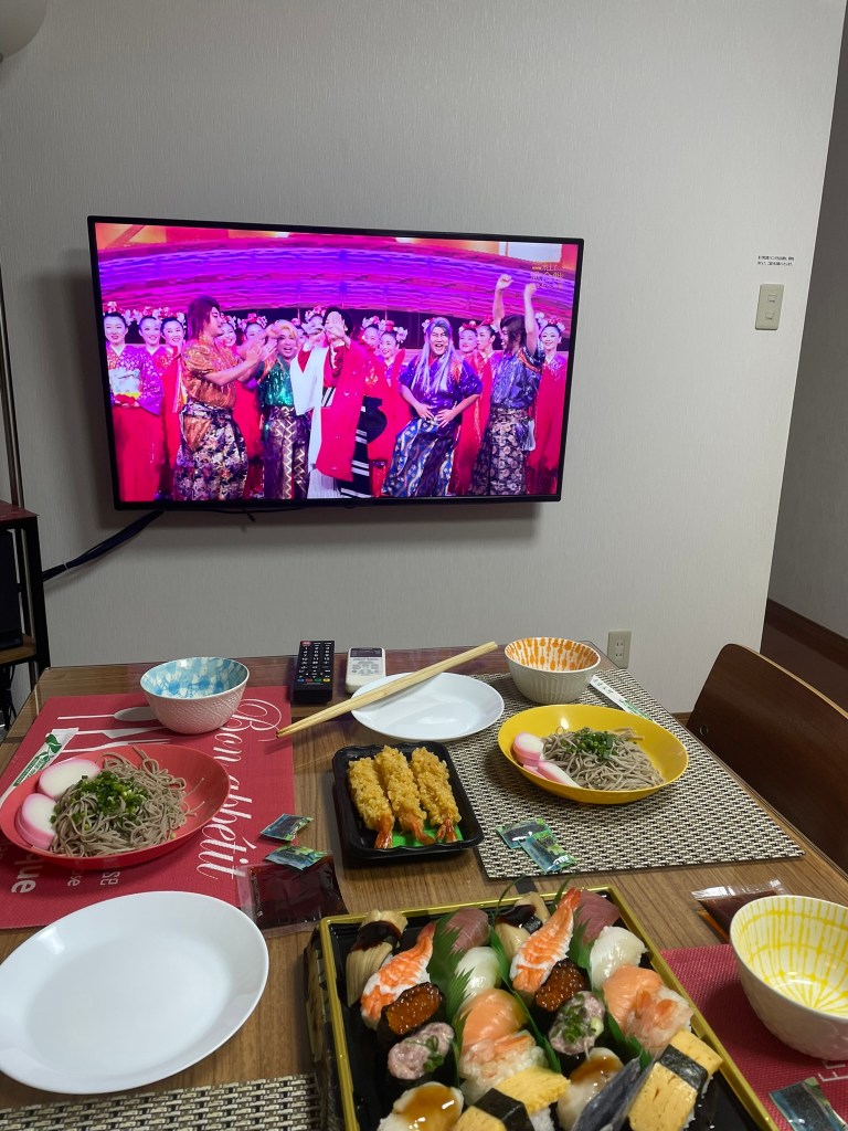 After a while I wonder why the timer hasn’t gone off yet, and I realize that I set it to 1 hour 30 minutes instead of 1.5 minutes. We take the noodles out of the water immediately, but the first batch is rather soggy. Fortunately, we do a better job with round 2 & 3 and I volunteer to eat the first one. We add the dipping sauce mixed with some wasabi and soba water into small bowls, and then it’s time to slurp away. During the meal, we share our respective families New Year’s traditions in a wild mix of Japanese and English. We also take a break occasionally and check the performances of the singing contest. Among current Japanese pop groups, there are also older artist playing classics and even a famous Korean girl group makes an appearance.
