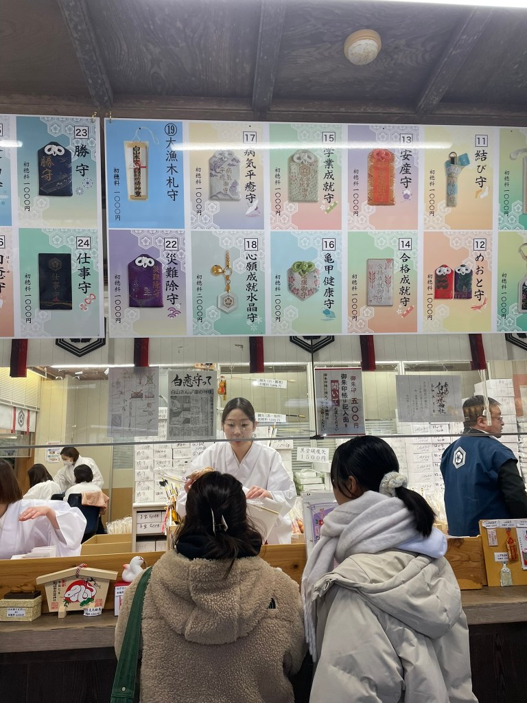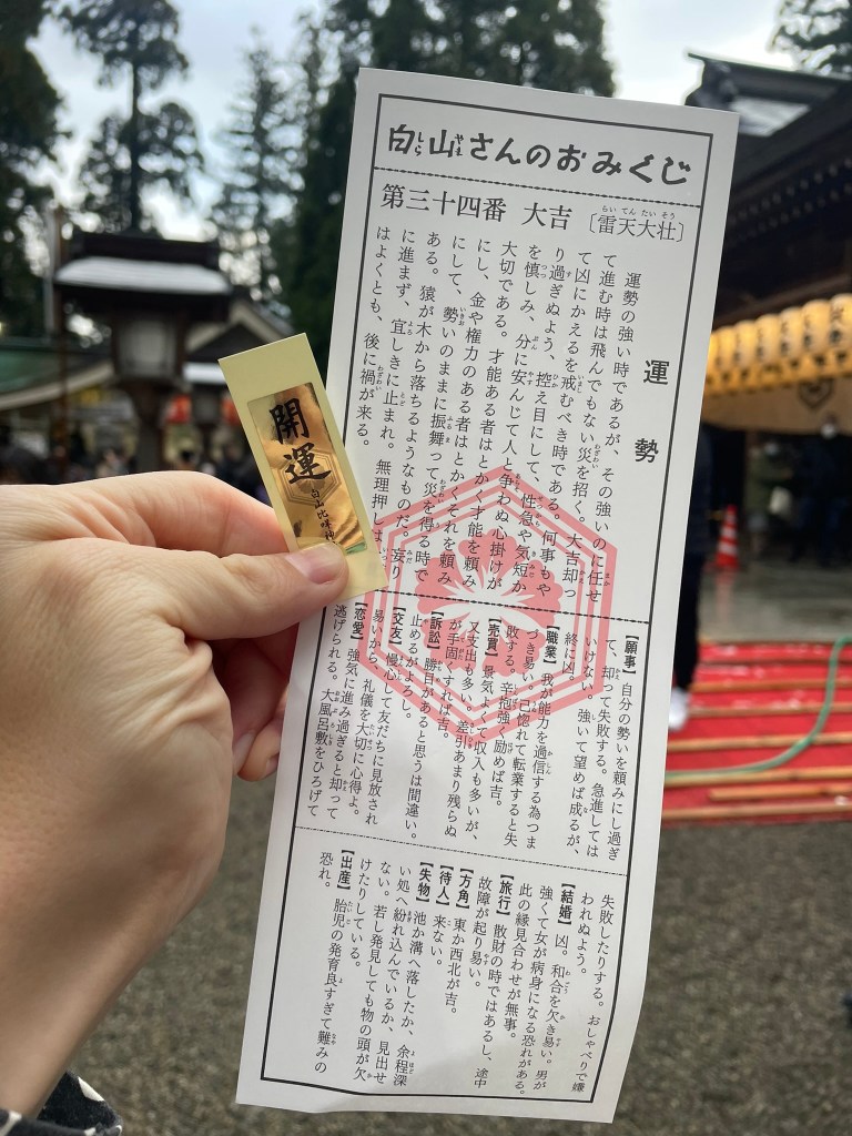 Once we reach the car park, it’s 8 am and the sun is shining onto the snow covered peaks of Mt. Hakusan. We pass the huge wooden torii gate, which marks the entrance to the sacred place and wash our hands at the designated fountain. Despite the number of cars, the Shrine doesn’t feel too crowded, and we don’t have to queue long for the prayer ritual. Then we pick up our Omamori – blessed lucky charms, which may be helpful for specific purposes. Marie and I also want to get an Omikuji, the traditional fortune scrolls that supposedly foretell the future for the coming year. I shake the wooden box strongly and draw a stick with the number 34 engraved on it. So the man behind the counter hands me a paper with number 34 and I am happy to see the characters 大吉 which mean “big luck”.