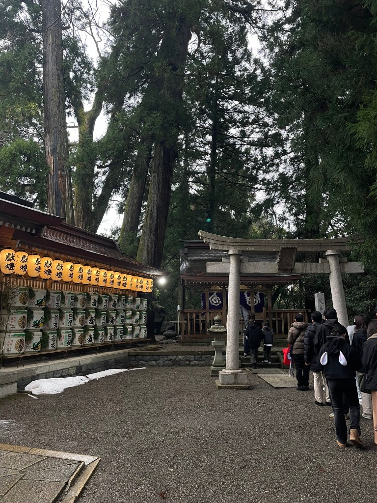 Layered up, we meet outside in the dark and wait for Kiko to maneuver her car out of the garage. We hop inside and I’m glad that both of the girls seem to be morning people. That means they can entertain each other, because I am definitely not talkative at 6am and even less so if the conversation is entirely in Japanese. We stop at a Family Mart to get some coffee and then head out of the city to the west and into Hakusan City. I’m positively surprised at the lack of traffic, and enjoy watching the sun rise behind the alps for the first time this year. We make great progress until about 2 kilometers before reaching the Shrine. Since one lane is completely closed and everyone is going to the same destination, we can only move little by little from here. Marie takes charge of the playlist, and we pass the time showing each other our favourite songs.