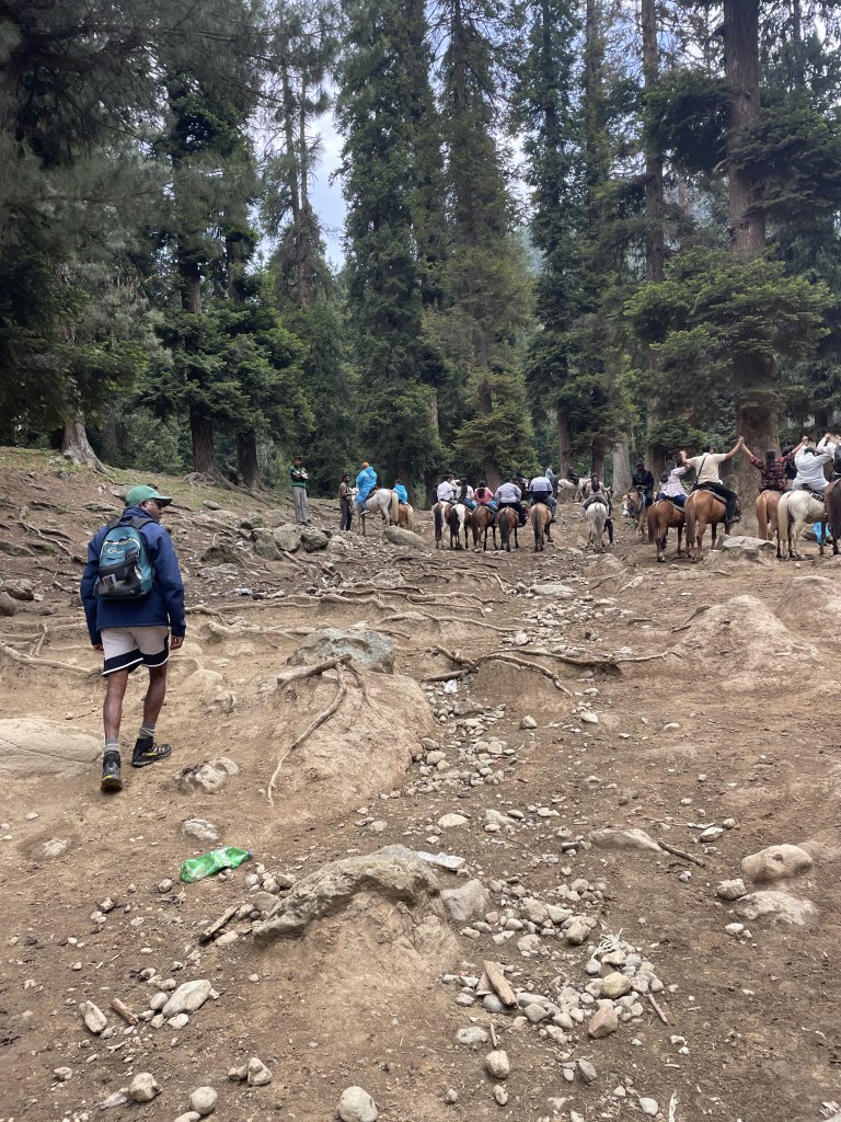 Once we turn a few times and reach the hillside forest, the bustling of the main street and the parking lot (for cars and horses) the atmosphere finally gets a bit more relaxing. As we ascend on the muddy trail, the price is getting lower and lower, but so is the availability of horses without a tourist on their backs. We are seemingly the only foreign visitors at this time, and almost all the Indian people opt for the easier way up. With Dino and John well over 60 years old, we take it slow and use the opportunity of regular breaks to take pictures of this interesting scene. The three of us are used to a very different version of hiking, and so far I can’t really see why the people here would call this place mini Switzerland. Then, after a particularly steep and muddy portion of the trail, we reach a flatter area where just as many horses are “parked” as on the bottom.