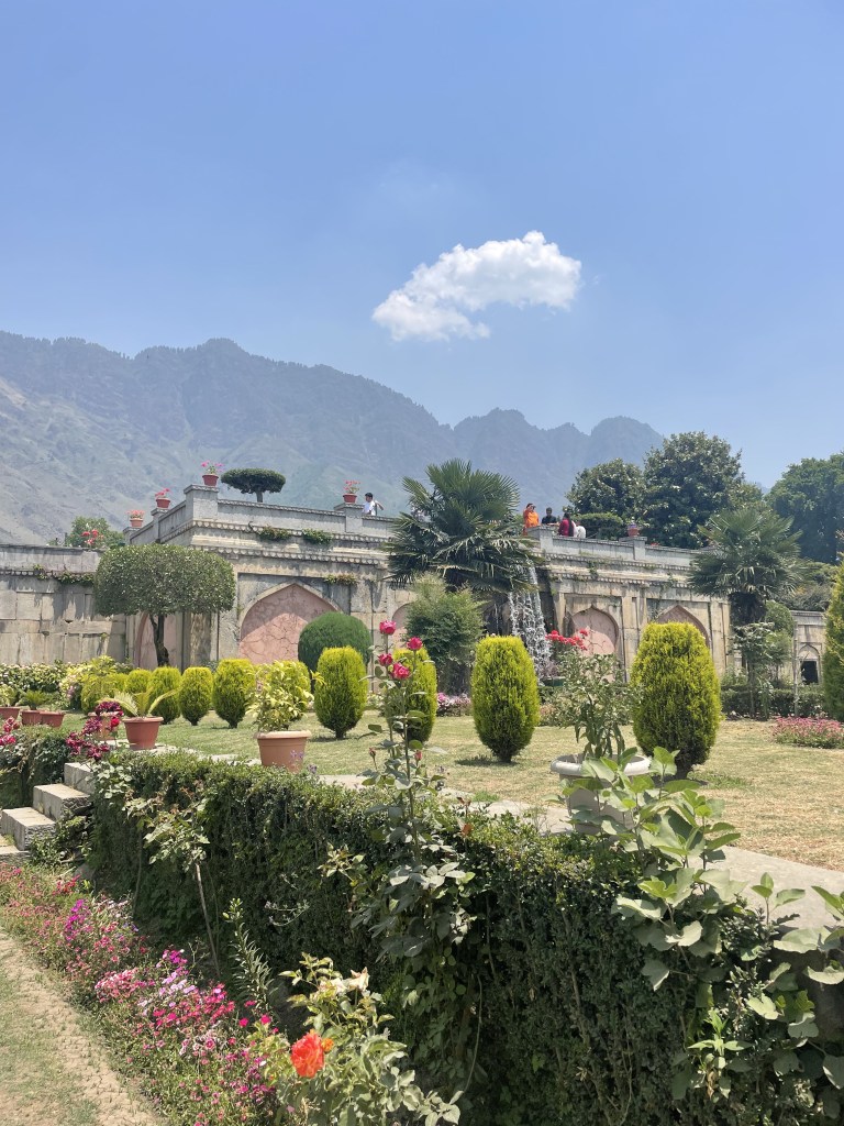 Then Dino and John come downstairs too for dinner and ask me if I had talked to Ahmed yet. For them too, he drafted up a plan which doesn’t match their expectations, and they have asked him to organize 2 day trips instead. Since the South Africans have been to India many times before, I trust that they make reasonable decisions and accept their invitation to tag along on the second tour to Pahalgam in 2 days. We chat more over dinner – mutton biryani for me and a vegetable version for the guys. Since we are all exhausted from the long travel day, we go to bed soon after dinner is over. Not even attempting to read in the book I brought, I swiftly fall asleep. I spend the next day wandering around nearby Nishat Garden, which is bustling with local school kids and tourists from Delhi and other parts of India.