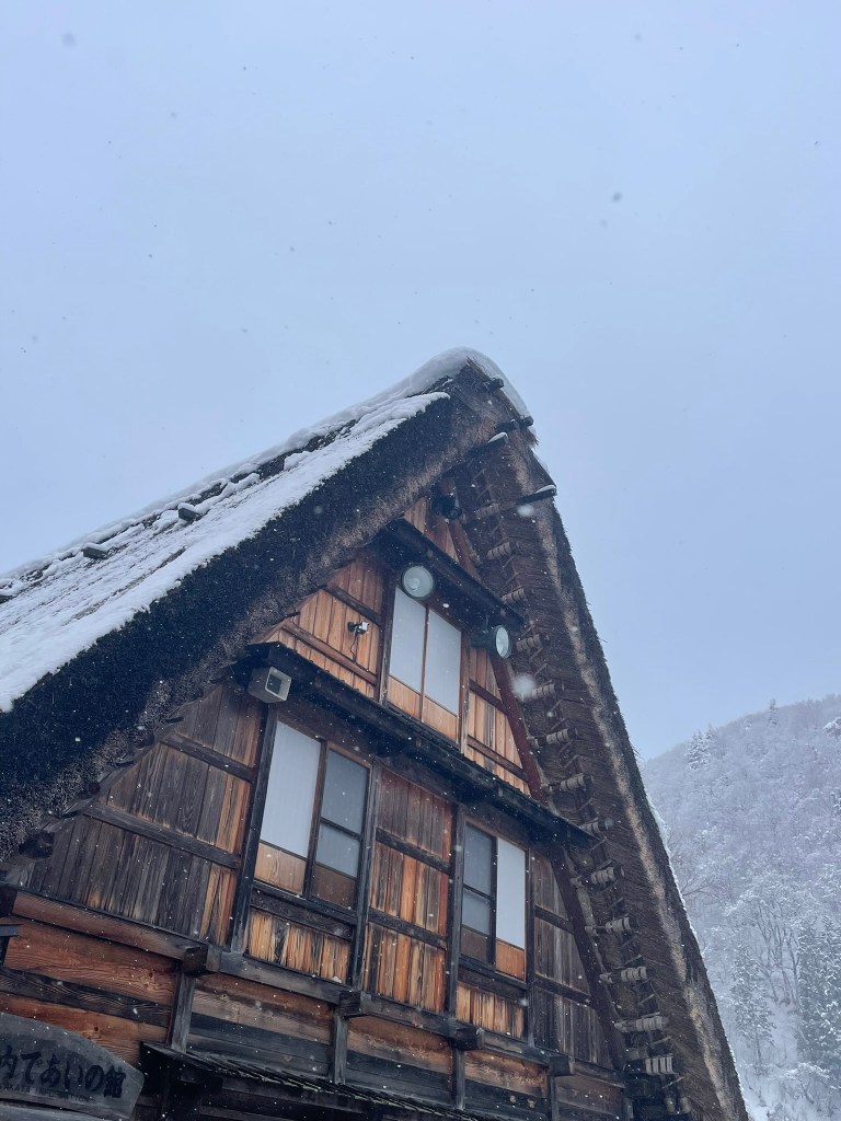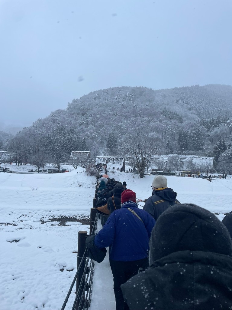 Between the history lesson, I take a moment to look out the wide open window on the third floor. From here I have a great view of the white landscapes with the deep forest in the background. Watching the visitors from abroad jump, stomp and sliding across the snow, I can finally understand why thousands of people come here during the wintertime. However, despite this realization and my work, I’m still not a fan of mass tourism and the incredible number of buses driving up to the UNESCO world heritage every day. My dissatisfaction grows even more when we rush past the souvenir shops at 4.30 pm, only to be faced with the giant queue we have to join to cross the river to get back to the parking lot. At least I know that the warm car is waiting for us and that this time I would also be able to take a nap during the drive back to Kanazawa.