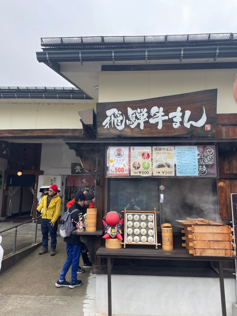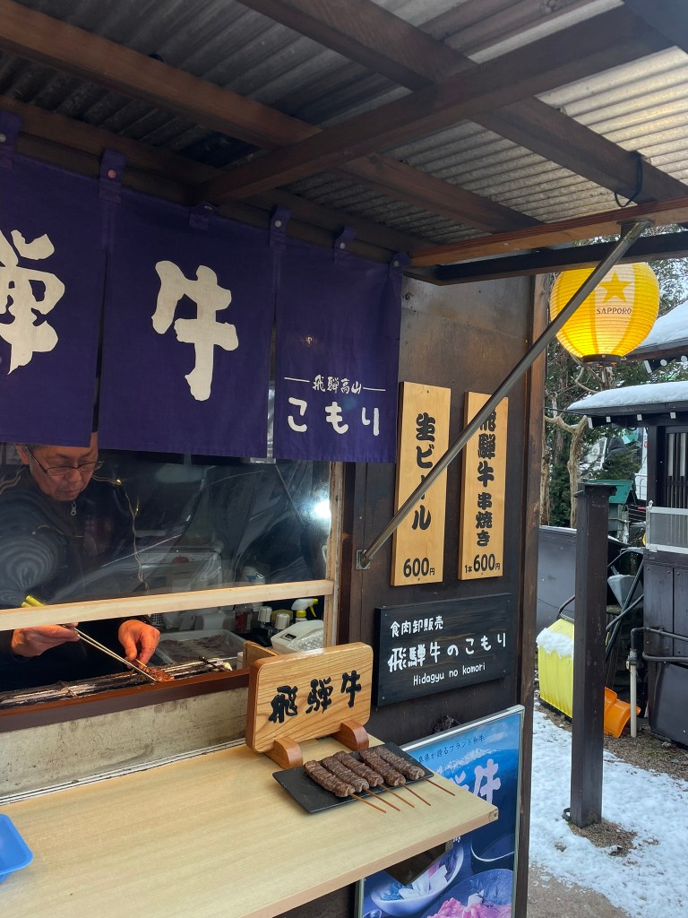 They only wake up around an hour later, just in time to see the scenery change drastically when we leave one of the long tunnels on the way. Looking at the rolling hills and edges of the highway covered in snow, everyone’s mood visibly lightens up. Another hour later, we finally arrive in Takayama. The small town located between high peaks is the main hub of northern Gifu prefecture. It’s well known for its picturesque old town district, the 2 festivals held in spring and autumn, and last but not least: the delicious Hida Beef. The latter is the item I personally am most looking forward to. But first, Sachiko and I have to guide the family — who’s already invested in an intergenerational snowball fight — to the morning market.