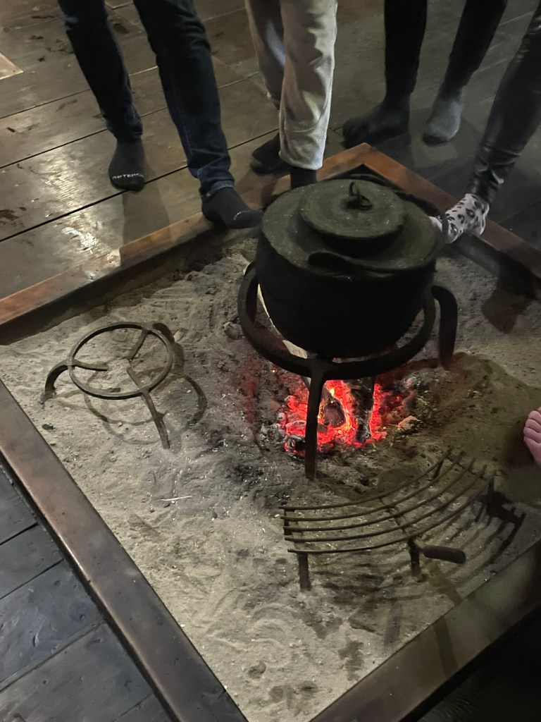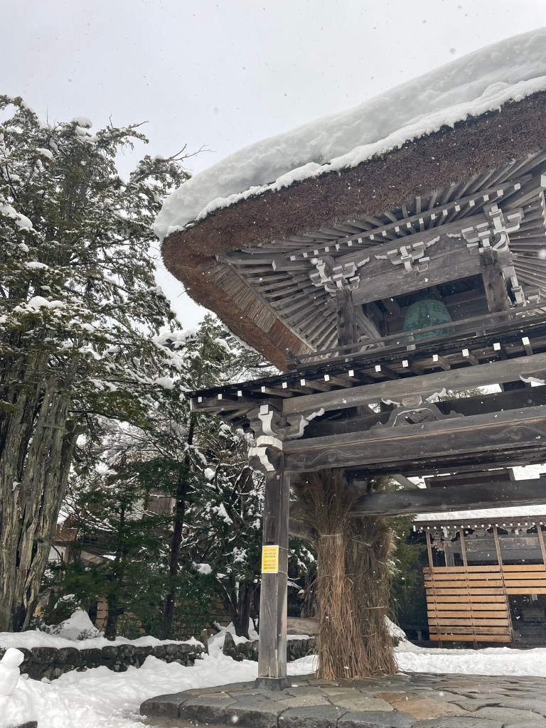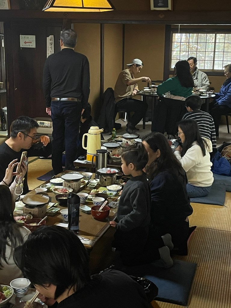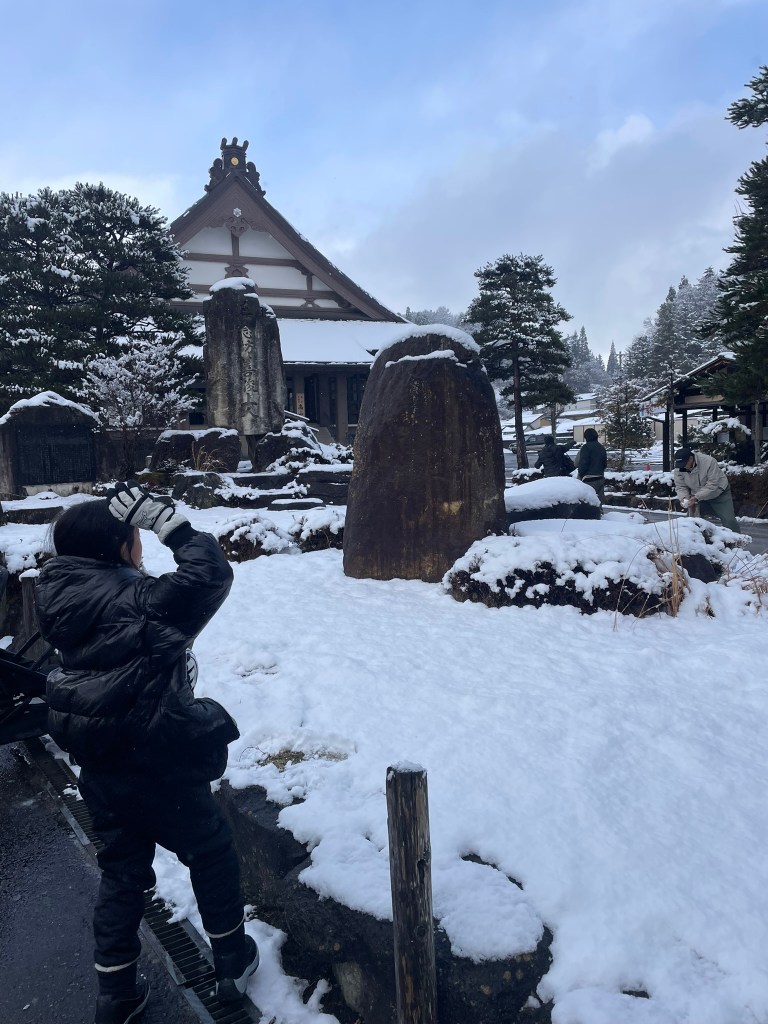 Our foodie talk is only brought to a pause when the rest of the group returns. This means back to the bus and onto lunch! Of course, the menu for today is beef. The driver takes us to a local restaurant on the outskirts of Takayama, where a large tatami room has been reserved for us. On each of the low tables, small porcelain grills are set up next to bowls of rice and pickled side dishes. The youngest kids are served Japanese curry udon and soon everyone is happily chewing away. Thanks to the electric space heater and hot food, we can heat up and restore our energy for the afternoon. After an extra order of raw beef sushi, Sachiko informs everyone that it’s time to get dressed again and hop back onto the bus. Just like she expected, the short walk in the fresh snow provokes another snowball fight, which delay our departure for Shirakawago. Only the promise of even more snow in the final destination can convince the kids to continue on.