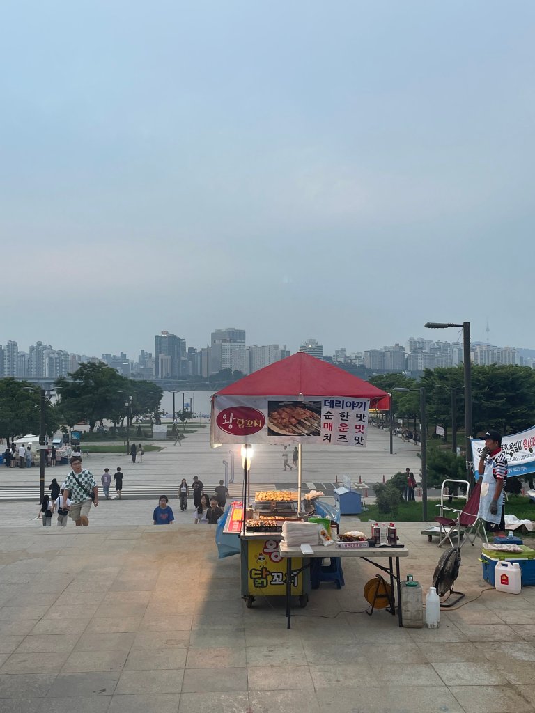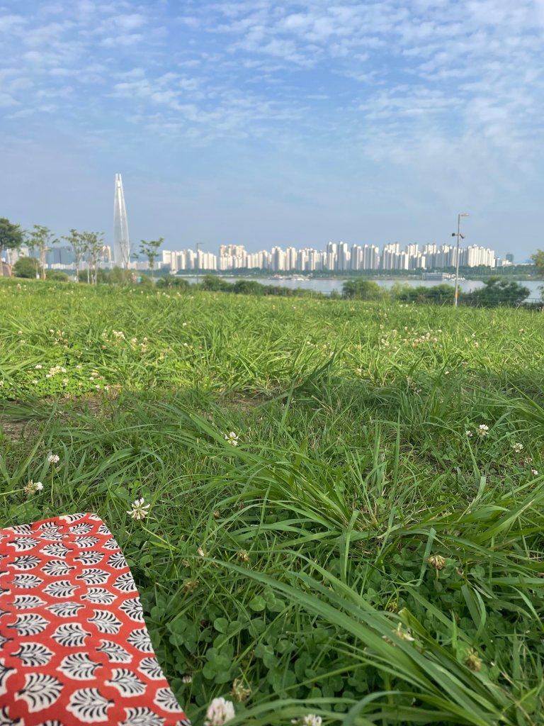 The next day I finish work early, so I can take a last tour to East Seoul to visit one of my favourite areas in the city. I take the train to Konkuk University Station and stroll through the small streets of Seongsu-Dong that are lined with hip cafés and restaurants for a bit. Since it‘s sunny but not too hot today, I decide to get some take out coffee and sip it at Han River. So I walk back to Ttukseom Hangang Park which is bustling with couples, groups of friends and families. Everyone is spread out on their picnic sheets and most people are munching on fried chicken or instant noodles bought from the pop up convenience store. Kids are running around, playing and there are lot of people excercising too. I first join the fishermen quietly sitting on their small chairs at the riverside, each one with a can of beer or two next to them. I take in the view of the stationary pirate ship turned wedding hall in front of me and the Lotte World Tower on the other side of the river. Looking for a bit more relaxation, I then venture up the small hill to set up my beach towel on the lawn under a big tree.