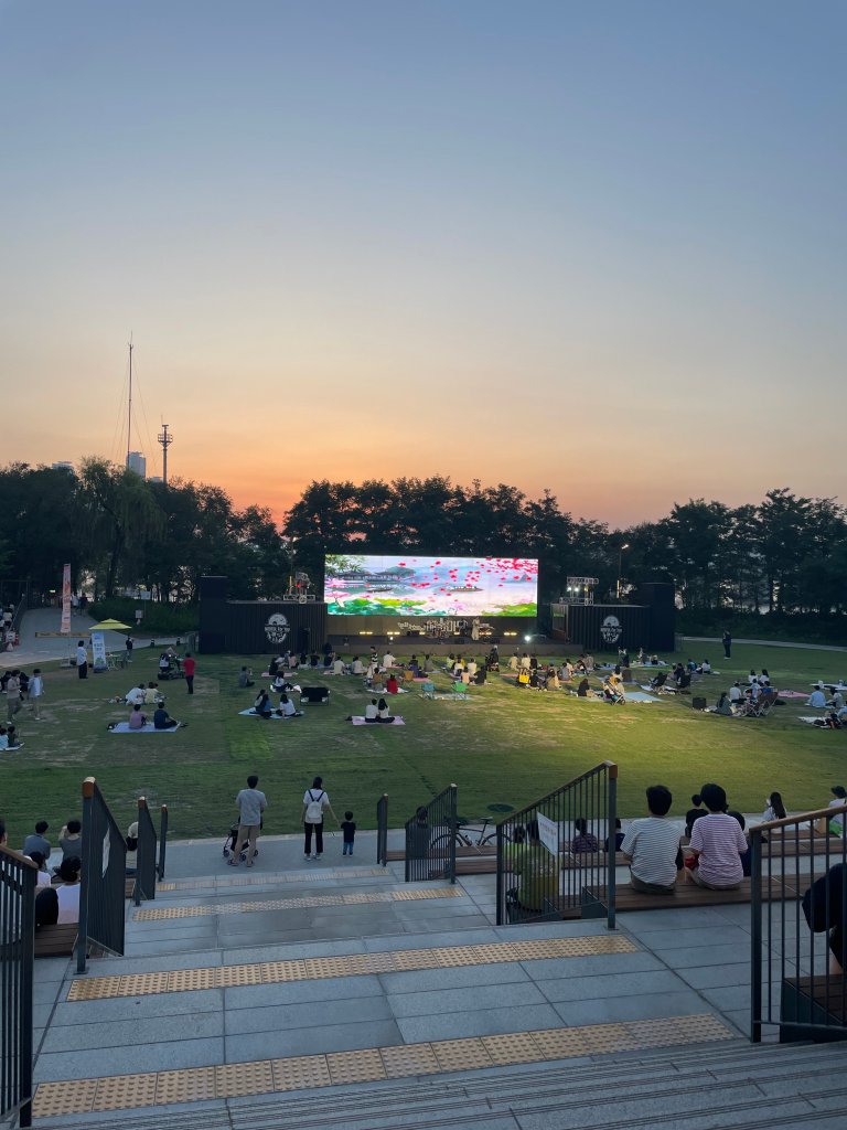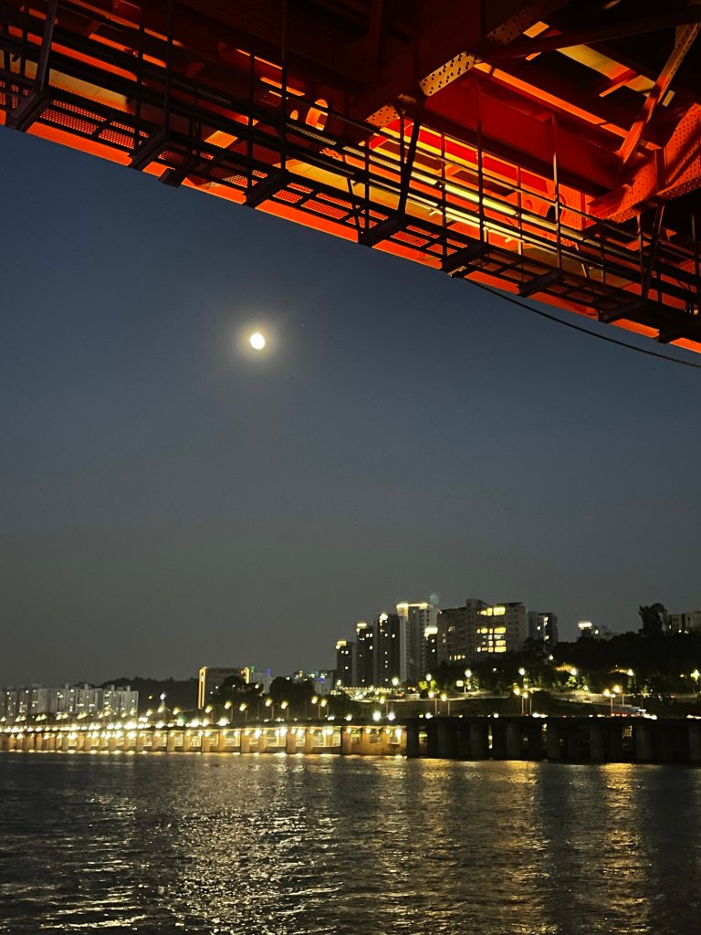 Actually, the only people I remember seeing are a group of christians holding up signs with slogans like „You are sinners“ in Korean and English. I also notice that there are A LOT of foreigners participating. Since Sinae is still out on a work assignment, I decide to return to her house via a detour to Han River. I take a direct bus to Nodeul Island and walk around the small park for a while, savouring the more quiet evening hours. It‘s sunset time and the heat of the day finally gets a bit more bearable. As always in Korea, there are lots of couples everywhere. They are having coffee or dinner at one of the food outlets or watching the show streamed at the openair cinema. Since the movie is in Korean only, I take this as a sign to head over to the waterfront, where I enjoy the clear sky and sunset view. Later I walk along the Han River side under the full moon. It seems to be a popular activity among locals too. I pass lots of people in sports outfits or holding hands with a significant other, cycling, running or simply strolling along the water.