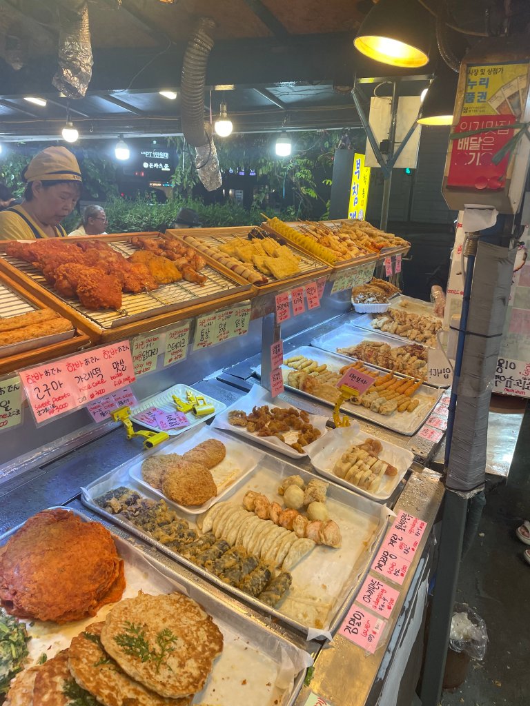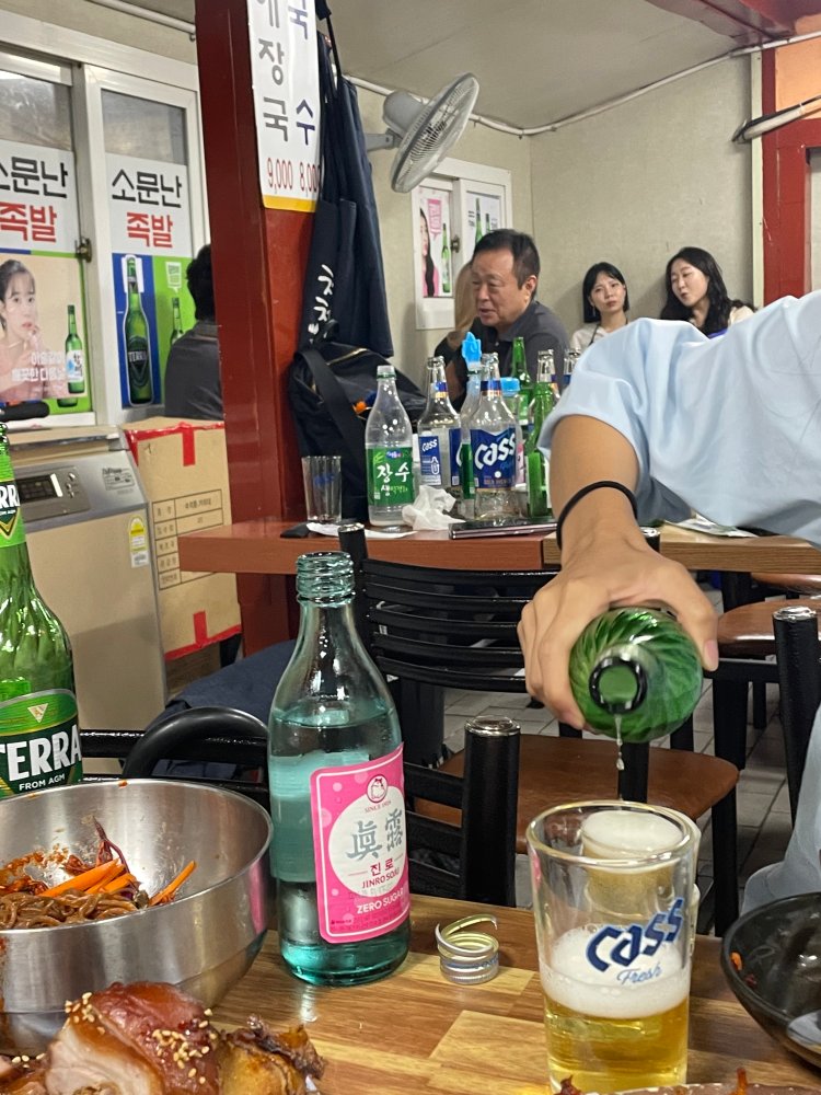 Alcohol is an integral part to surviving the rainy first part of the Korean summer, it seems. On a particularly gloomy day, Sinae texts me sometime in the afternoon with directions to a metro station in central Seoul. She’s doing some shopping in the area and will be meeting friends for drinks there later. So in the early evening, I head out into the warm summer shower and take a train across Han River. I meet Sinae at the station before heading over to the tent bar area, where her friends are already sitting at a table completely covered with barbecue meat, side dishes and several bottles of soju and beer. That night, I learn from Chae Bin how to mix the Korean liquor with beer like a professional. We take turns in pouring each other’s glasses, joke and eat for a while. Then, just when I’m getting really full, Chae Bin’s boyfriend suggests that we head over to another tent bar where they have really delicious jeon (kind of salty Korean pancakes).