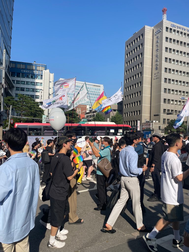 I’m slightly overwhelmed by the amount of people in the metro from the Expressway Bus Terminal to Sinae‘s house. During the 4 weeks I spent in the countryside on Geoje Island close to Busan, I only walked along the seaside and at most took local busses. But now I‘m on the way to drop off my luggage at my friend‘s house and then I plan to immediately head back out to the city center for today‘s Pride Parade. As soon as I get out of the metro in Myeong-Dong, I can see lots of people carrying various items with rainbow flags. I follow them to the main street. The atmosphere is quite different from the parade I went to in Valencia the year prior. There is only 1 float and of course, the music played is mostly K-Pop songs to which everyone seems to know the choreographies. There are not many people standing at the side of the street, cheering on the participants like they did in Spain.