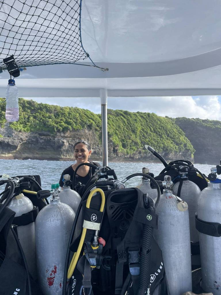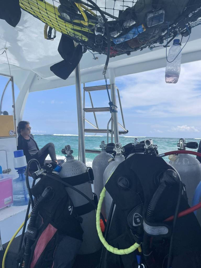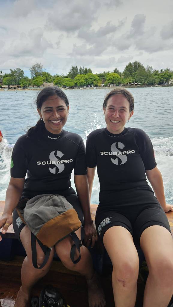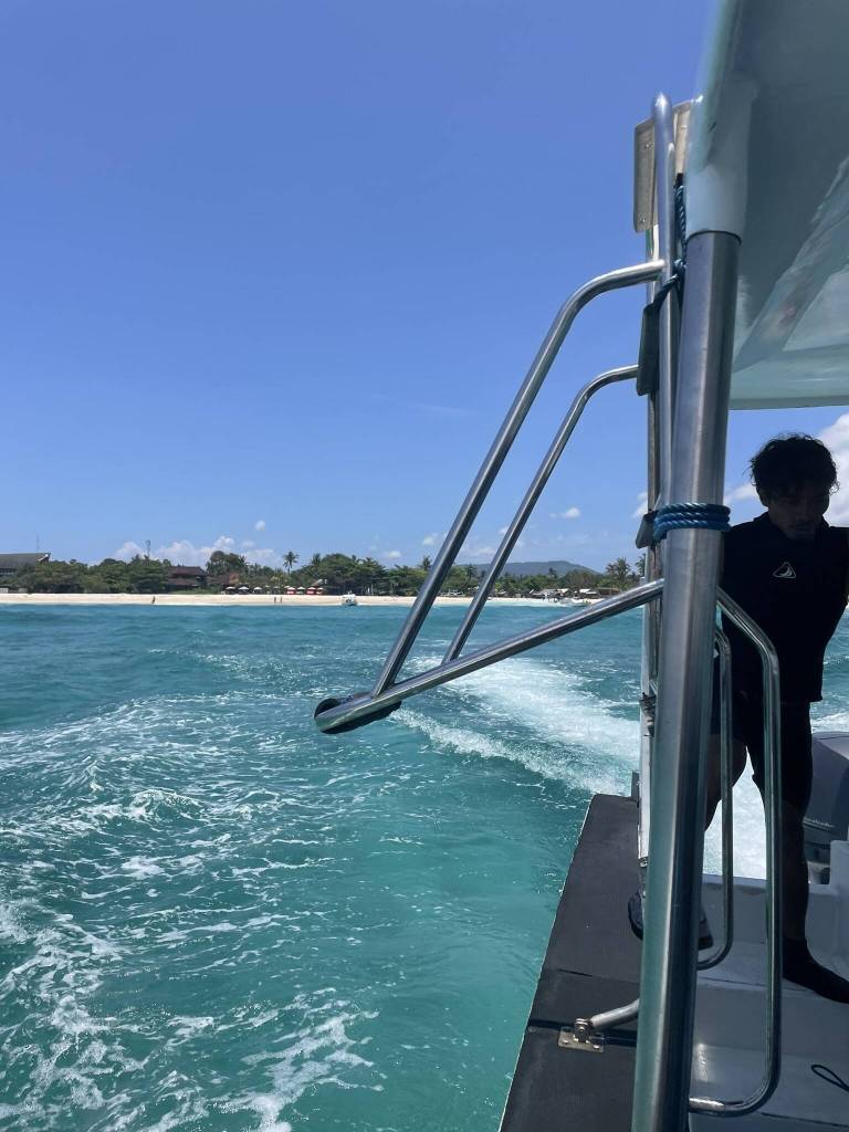 During the next 45 minutes, we meet 4 more of the majestic rays, as well as moray eels, an octopus and lots of colourful fishes and corals. It‘s a dream come true and noone really wants to get back on board when the guide signs „up“. A little tired but very happy, I climb up the ladder and gratefully grab the cup of water one of the crew members hands me. Trying to stay out of the way while the rest of the divers get back on the boat, I can only quickly check in on Neha before we are speeding off again to the next dive site. It‘s only about 45 minutes later, when we arrive at Crystal Bay, that I realize the effect the bumpy boat ride had on my friend.