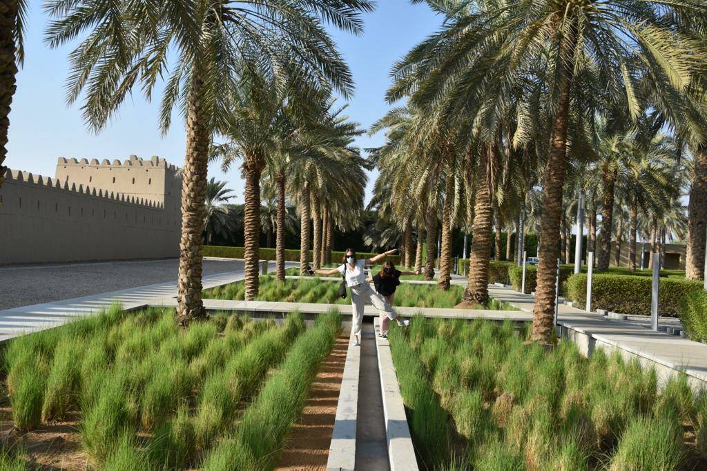 Well-fed, we finally start our exploration of the town in the early afternoon. First up is a visit of Al Jahili Fort. One of the most iconic historical landmarks in Al Ain—and one of the largest forts in the UAE. It was built around 1891 and originally served as a fort to protect the city and as a residence for the local ruler. The thick, sand-colored mudbrick walls, round watchtowers, and a large central courtyard have been carefully restored and now host galleries and exhibitions. We spend a few hours hiding from the sun in the naturally climatized Majlis, where we have another heartfelt conversation – just what the traditional sitting room has been used for in the past.