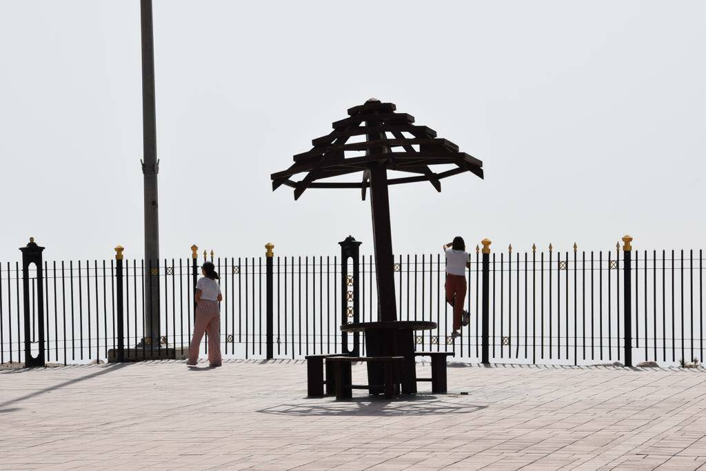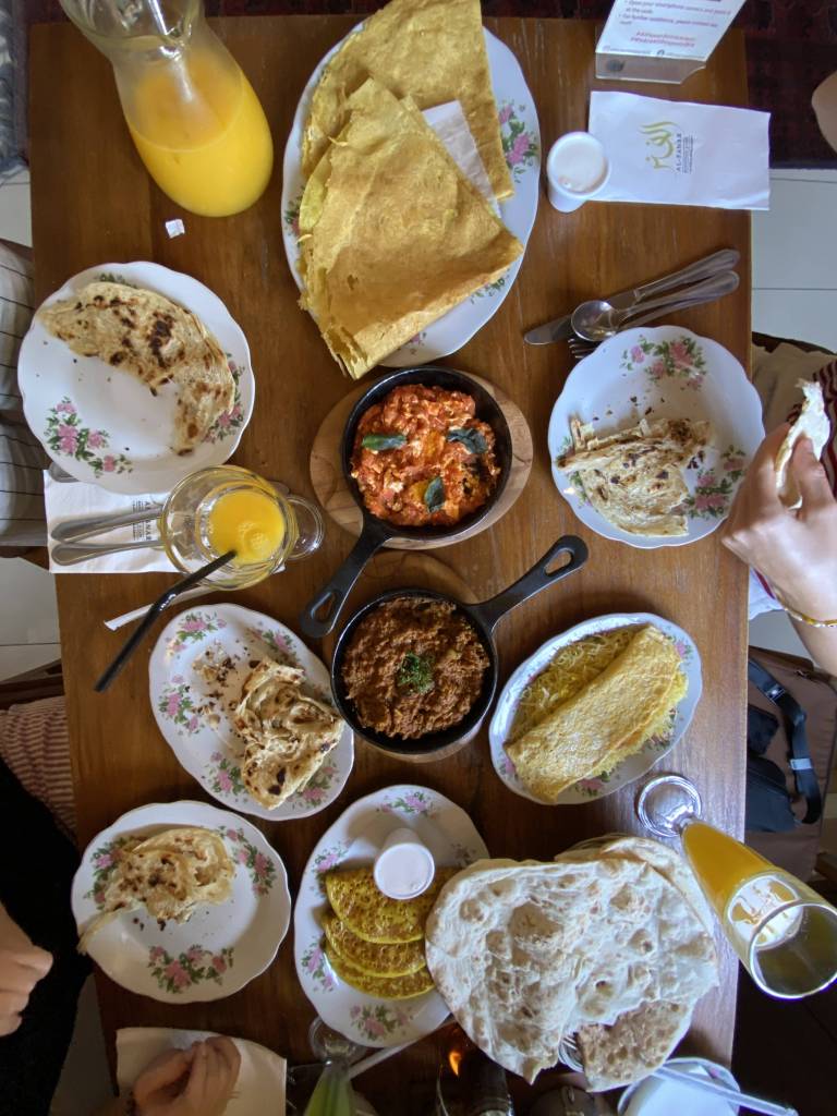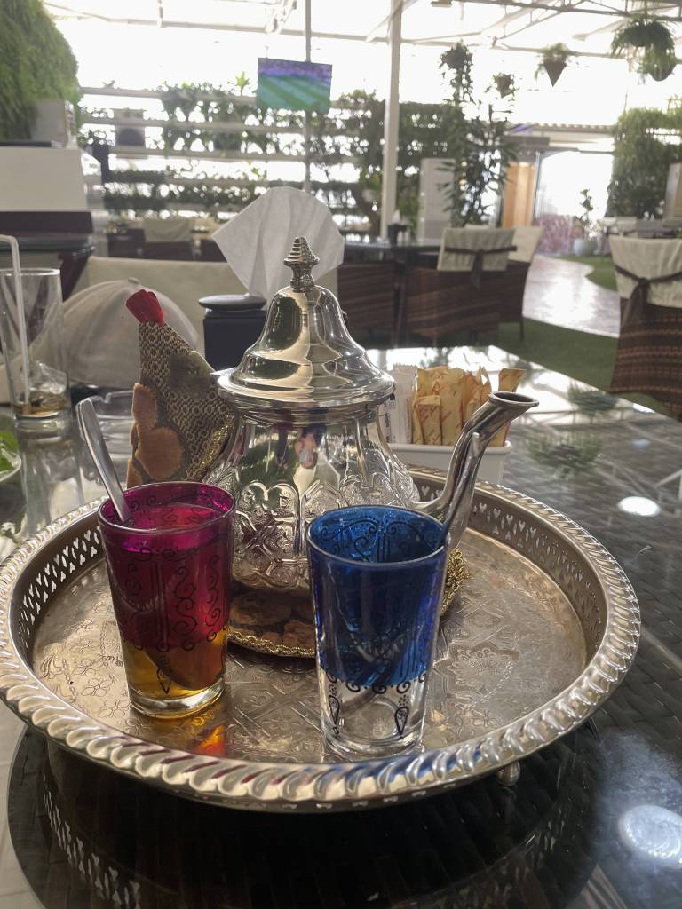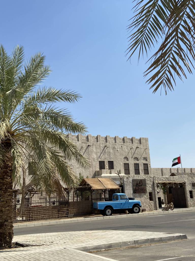 Needless to say, we sleep in well the next morning and first take in the view from our balcony by day before getting ready to drive down the hill and explore the city. While Liana drives, Alina is in charge of music and I search Google Maps for a brunch place. We soon unanimously decide on “Al Fanar” for a taste of the Emirati cuisine and shortly after pull up in the huge parking area in front of the restaurant. The sun is out in the desert country, and I’m glad to be moving seamlessly from one air-conditioned space to the other. We choose a table in the courtyard of the house that looks like a replica of an ancient stone building. Suddenly realizing that we are indeed quite hungry, we order a selection of dishes and different breads to share, along with fresh fruit juice and mint tea. All the flavours are simply incredible and we continue the conversations from the previous night in between bites of keema, scrambled egg and saffron rice.