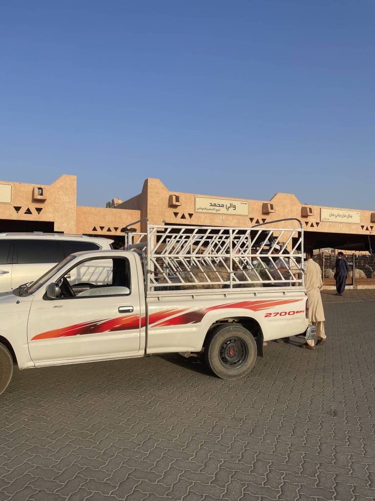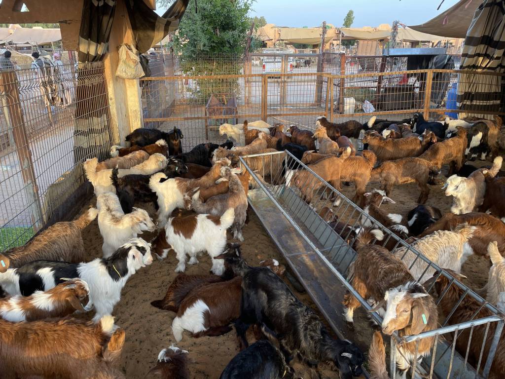 But not only camels are for sale. There are also vendors offering goats, cows, and other livestock. Since the market is most lively in the morning, we are the only tourist at our time of visiting. The vendors are chatty and more than once we receive unasked for offers for a goat, and even a baby camel. Out of curiosity, we then try to figure out the average prices by comparing other people’s offers. One of the guys working at a camel stall takes this for real interest and introduces us to his best animal: a racing camel worth several millions of Dirham. We politely decline the offer and head over to the half-open goat enclosure.