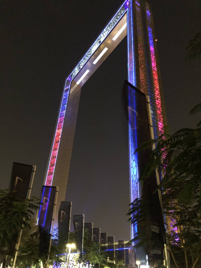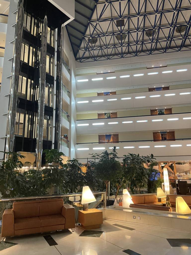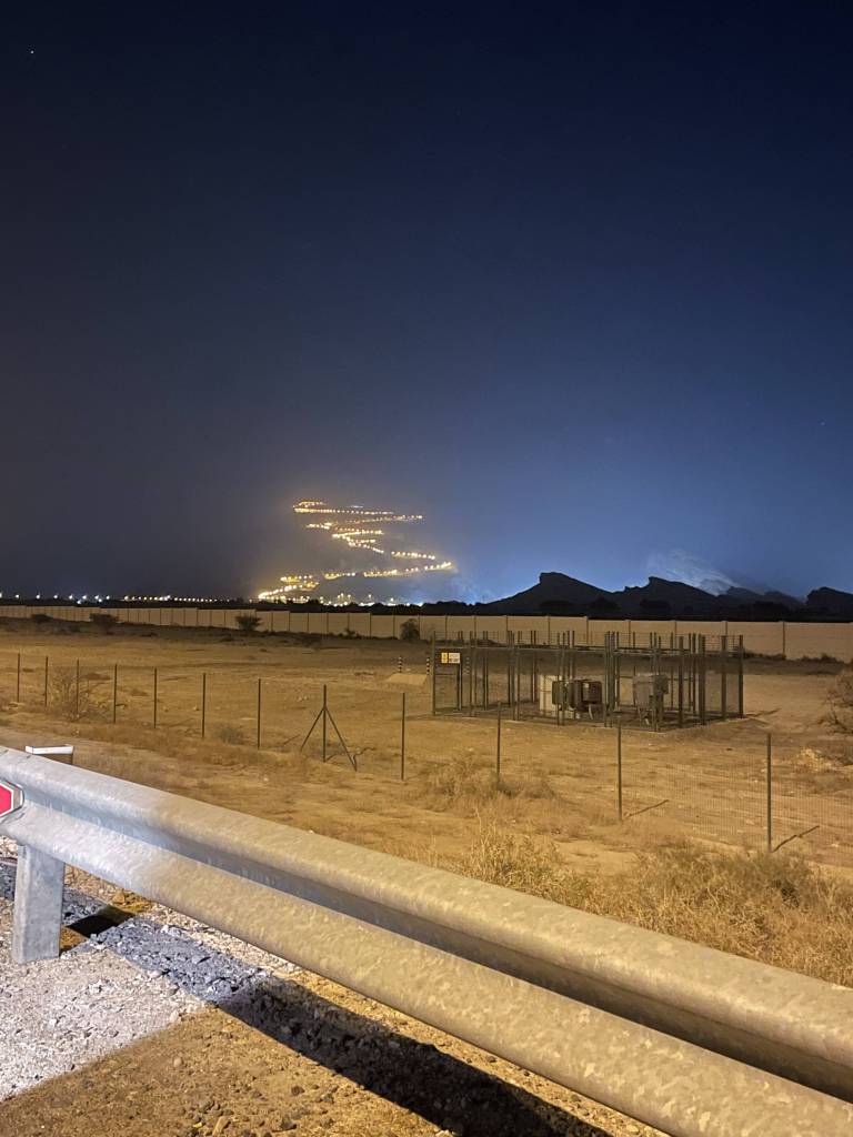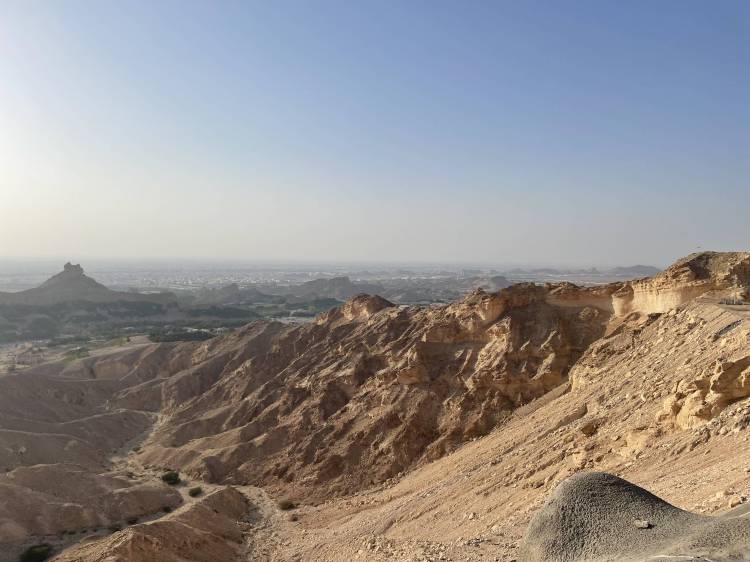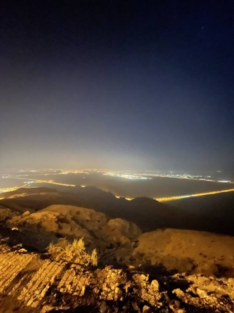 By 9pm, we pass the lit up Dubai Frame on the Sheikh Zayed Road and around 1.5 hours later we leave the highway on the southern side of Al Ain. We’re staying at the Mercure Grand Jebel Hafeet Al Ain Hotel, which was recommended to us by a co-worker at the Swiss Pavillion. When we see the streetlights lining the curvy street leading up to the top of Jebel Hafeet, we know we made the right decision in following Damien’s advice. For a hotel in the middle of nowhere, the building is of a very impressive size. But what strikes me the most, upon entering the lobby, are the large portraits of whom I think is the ruler’s representative of Al-Ain alongside the ruler of the UAE. Under their observing eyes, we take the elevator up to our room, where we quickly unpack. Since we’re all not quite ready to sleep yet, we then head back out to the terrace to take in the night view and end up having the deepest conversations about any topic that comes to mind until 3am.