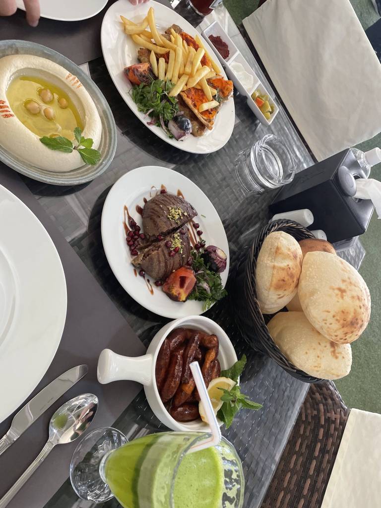 We walk around the maze of paths for a while and play with the fallen palm leaves. When the sun really starts to set, and we hardly see where we are stepping we realize that we need to find a way out. Somehow we make it to the other side of the field and luckily find another unlocked door, which leads us back to the actual alley. The three of us do our best to appear innocent and are soon picked up by one of the golf cart drivers in Emirati dress. He brings us back to the exit and we return to our car. On the way back to the hotel we discuss the dinner plans and opt for a meal at the accommodation’s restaurant on the terrace with a view. That night we go for another stroll around the hotel premises but vow to sleep earlier. After all, the next day we need to return to Dubai. But first, we check how close to the Omani border we can get. The answer: not too close and there is no border office in sight. Then we have another brunch at Al Fanar before tackling the drive home through the desert.