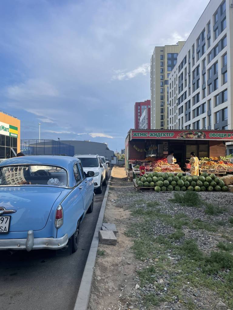 During my lunch break on another day, I go on a walk around the neighbourhood to clear my head. I step back into the convenience store on the bottom of Dariya’s building where I found the bottles with a milky looking drink in PET bottles. I take another look and realize that according to the label it’s actually horse milk. I have heard tales of fermented horse milk being handed out in Mongolian yurts, but didn’t expect to find it in downtown Astana. On this occasion, I suppress my usual curiosity and refrain from buying the mysterious refreshment. Instead, I head back out into the August heat and explore a small fruit stall. Watermelon seems to be the main seller, and I wonder if the lady behind the old-school scale and register also accepts card or other cashless payment forms.
