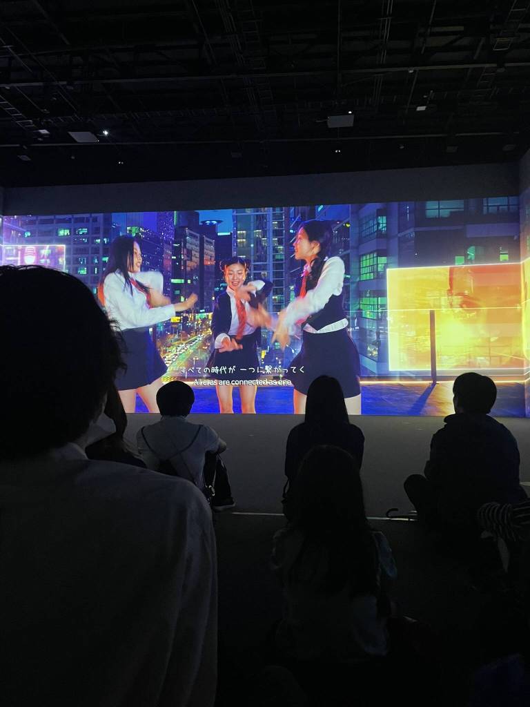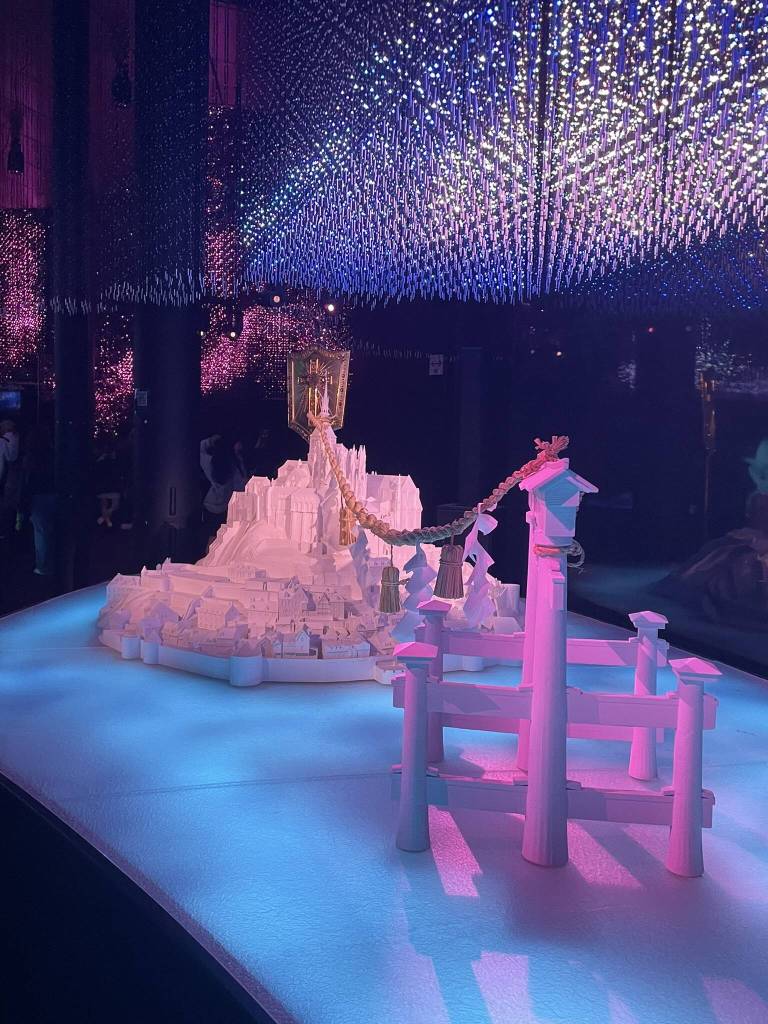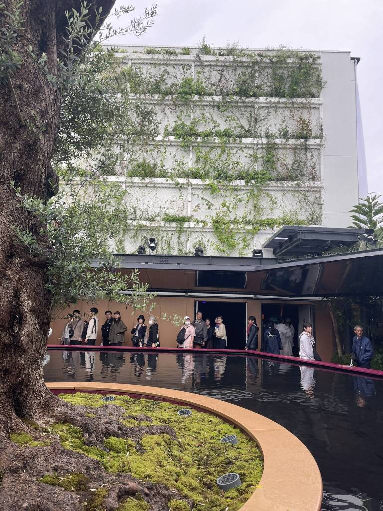 Giving Dariya and my parents a bit of time to get to know each other, we stroll along through the site for a while. The rain has stopped and with energy left for one last pavilion visit, we gladly take Dariya’s offer of a fast pass for France pavilion. After all, it has one of the longest lines. Trying to remember their exhibition in Dubai, I can only picture the impressive size of the building in general. So I enter without many expectations and am pleasantly surprised. The first room is an hommage to a French-Japanese anime, followed by a clearly sponsored Luis Vuitton art installation featuring their iconic suitcases. A modern dance video set on the roofs of Paris and an exhibition of Alsace vineyards close the tourism section. In the courtyard, there is even space for a large olive tree set on an island in the middle of a pond. Then the tour continues back inside with more designer and art exhibitions featuring. My favourite installations are a large wall of white dresses and the sculpture of Miyajima’s famous Torii connected to France’s Mont Saint-Michel.