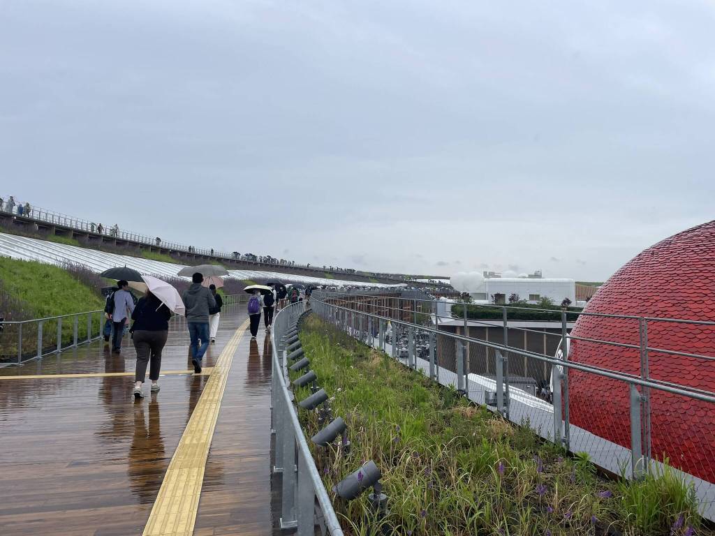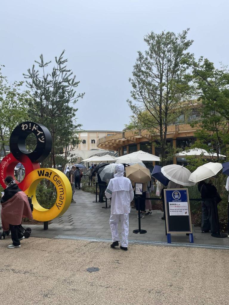 And then finally the day has come: On a rainy Saturday in May, my parents and I follow the signs to the Chuo Line at Hommachi Station in central Osaka. We catch a train scheduled to arrive at around 08:40. As expected, there are already quite a few people queuing in the rain. We follow the crowd into the fenced off section for 09:00 entries and wait for the security gates to open. Most of the surrounding visitors speak Japanese and we only see a few other Westerners. There are plenty of families and the kids are being in waterproof gear as the rain continues to fall. A lot of people also use the waiting time to eat a breakfast Onigiri or like a lady standing next to me, to research food options on-site. She came prepared with a print-out map including handwritten notes and a list on her phone titled “things I want to eat”. Once again, I’m reminded why I love Asia. Then, at around 09:45 it’s finally our turn to enter the site after a short security screening.