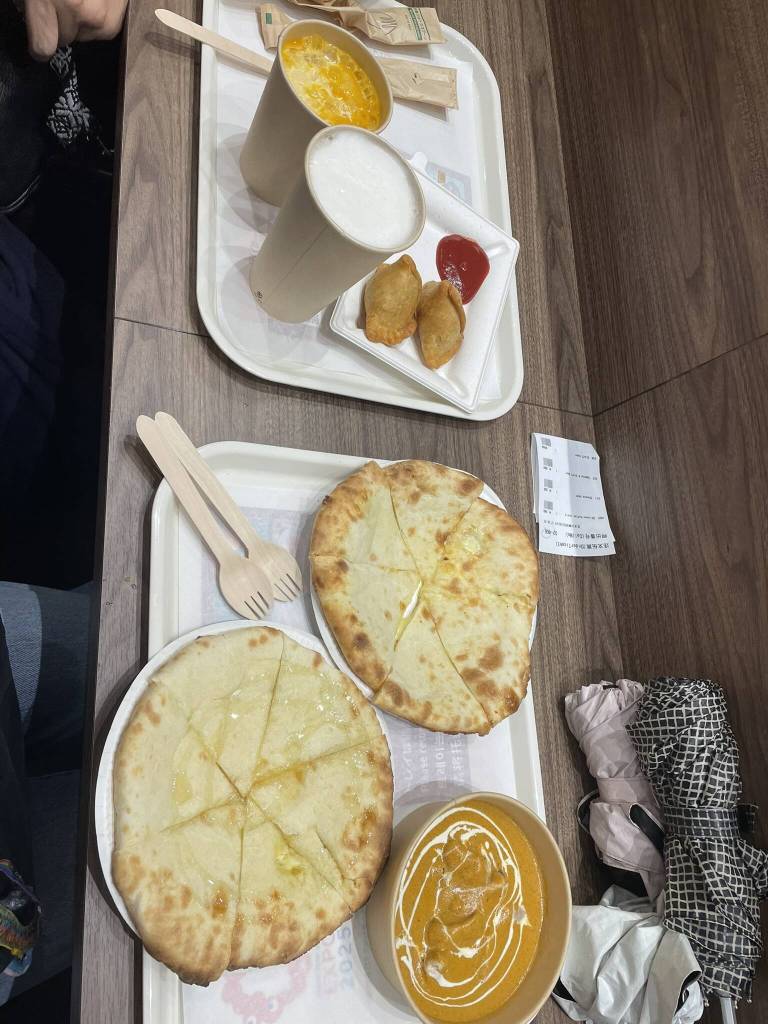 By now quite hungry, my parents and I return to the VIP entrance, asking if there is also special access for us to the Heidi Café. Unfortunately, there is not and the waiting time is 2 hours. Needless to say, we look for other options. We cross the “Signature Zone” and the “Forest of Tranquility” with little luck, and finally return to the restaurant section north of the “Connecting Lives Zone” where we started. On two floors, pop-up restaurants set up in large shipping containers offer all kinds of foods from all over the world. We look around for a bit, hoping for indoor seating, since the rain and wind are not inviting for a picnic session. Finally, we settle on an Indian fast food place where we order curry, naan, beers, and a mango lassi. The flavors are authentic and being able to sit down without getting soaked is a huge plus. However, as always at these kinds of events, the prices are quite high.