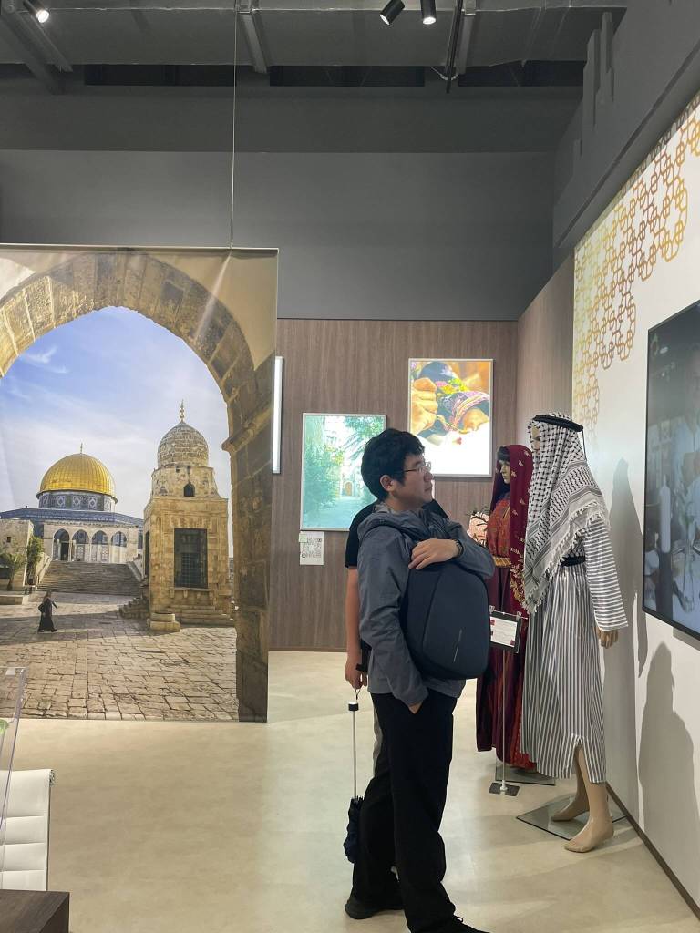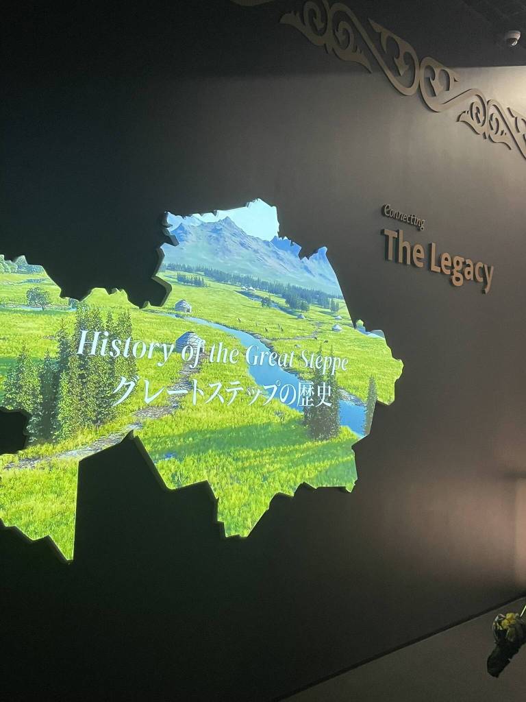 Since I have plans to meet up with a friend whom I met at Expo Dubai, we return to the “Connecting Lives” area by means of the ring. However, this time, despite the still horrendous weather, we walk on top of it rather than in its shade. We still enjoy the view of the interesting pavilion architecture from above, but I’m sure that it would be an even better experience on a sunny day with blue skies. Upon arrival at the location that the map on the Expo app shows me for Kazakhstan Pavilion, I’m surprised to see that it’s a shared “Commons” space. After all, the counterpart in Dubai was one of the largest and most impressive structures. Nevertheless, there is a 1-hour queue here too, and we are lucky to be let in by my friend Dariya through the fast access. The guide, a young Kazakh girl, professionally conducts the tour for the group we join in fluent Japanese and English. The exhibition is fairly similar to Dubai, but since I now have actually visited the country, the explanations of the nature and culture leave a totally different impression.