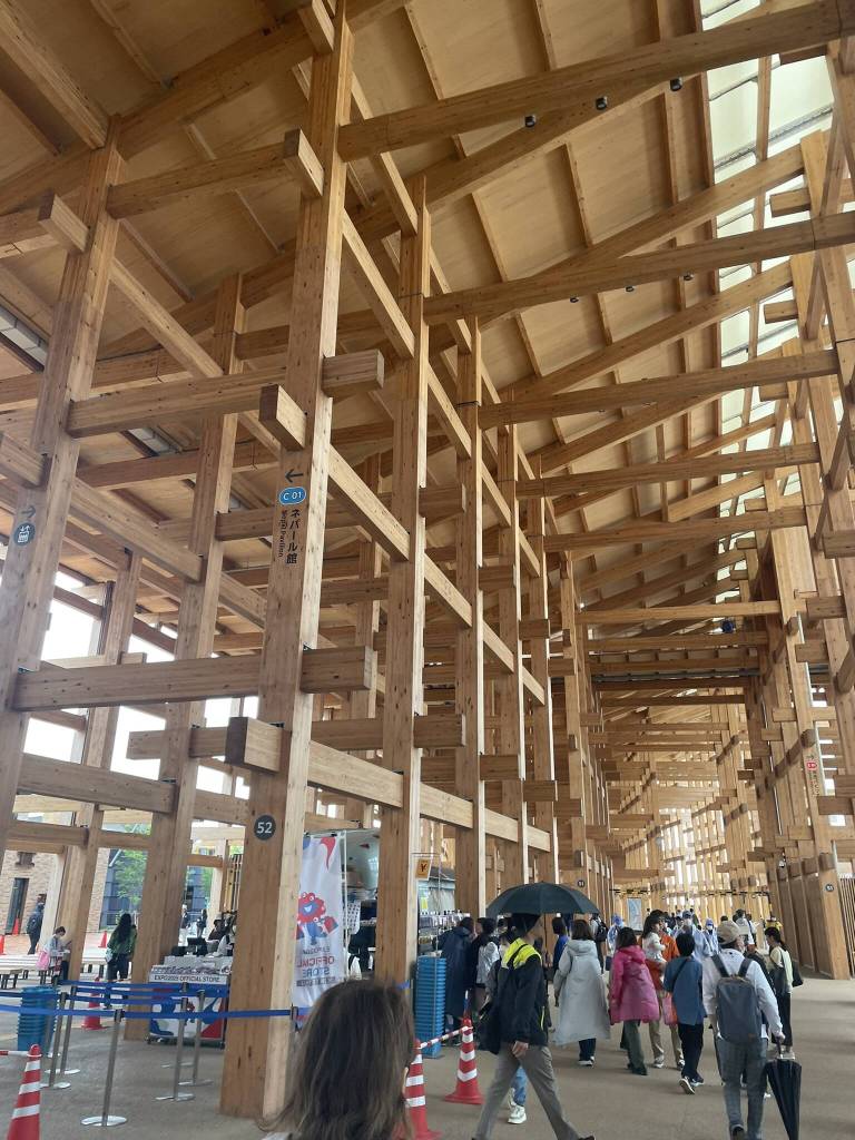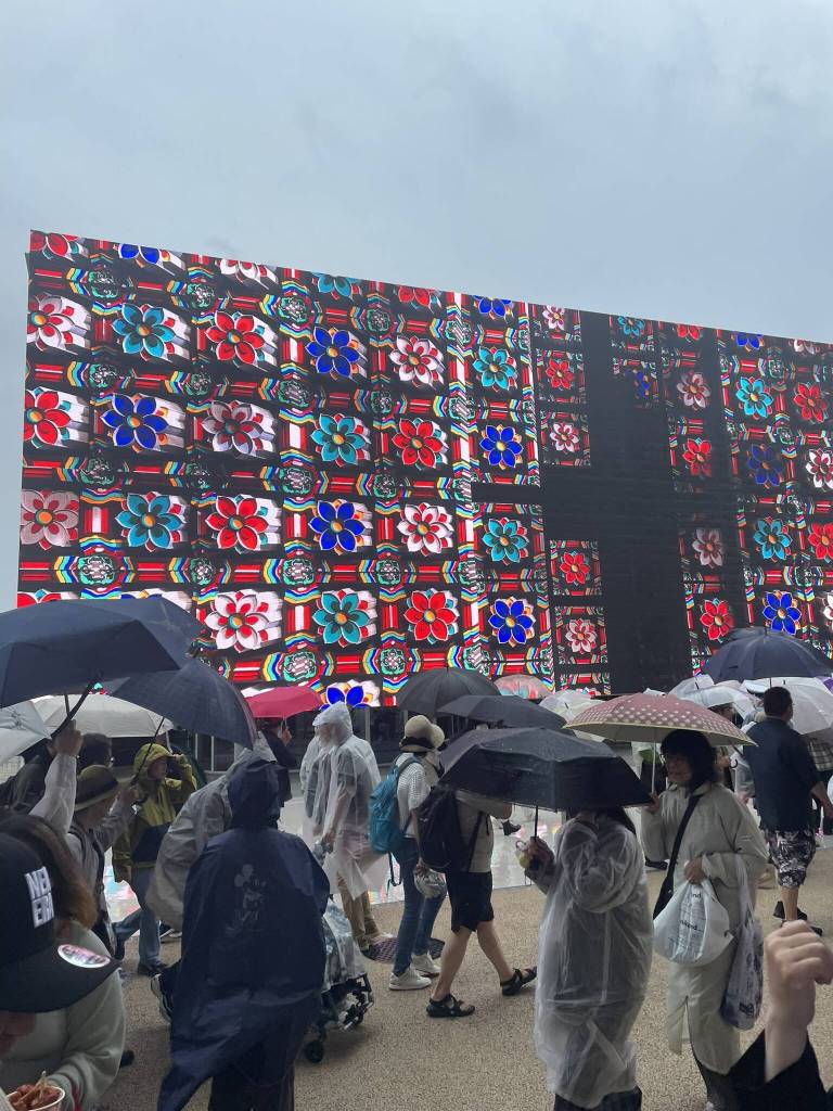 With renewed energy, we head back out into the bad weather. Following the wooden ring for some protection against wind and rain, we look out for pavilions with less waiting time. But “2 hours” or “temporarily closed access due to overcrowding” are the regular responses. So we resort to enjoying the impressive architecture and outdoor installations like the Korea Pavilion’s LED facade. Then, in the orange “Saving Lives” zone we get lucky with the queue to the “Commons” pavilion re-opening just when we pass by. We quickly enter and stroll along the small booths showcasing smaller nations. Just like in Dubai, the differences in the exhibitions here are vast. While some countries have multiple representatives welcoming visitors, others rely on uninterested volunteers or none at all. Some focus on selling their country as a tourism destination, while others are eager to show the connection to Japan — even if that means calling out the former colonial activities.