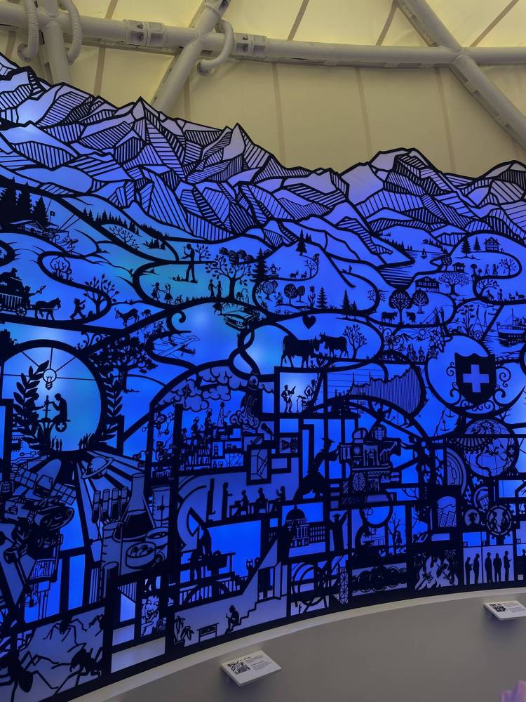 The indoor exhibitions are divided into sphere-shaped rooms. The first sphere is rather small and houses the tourism section. A large paper cut showcasing the classic image of Switzerland covers the wall. Mountains, cows, and steamboats are backlit by color changing lighting and accompanied by the sounds of the Swiss national anthem. The second sphere is more interactive and focuses on the innovative side of Switzerland. While walking up a ramp, visitors can activate soap bubbles by talking into microphones fixed on the rail. Another exhibition featuring augmented reality aims to present the many policies around SGDs that are connected to Switzerland. And finally, in the temporary exhibition room, projects from prestigious Swiss universities like ETH and EPFL are closing the journey “From Heidi to High-Tech”. Overall, the interior concept is quite similar to Dubai, but adjusted to the limited space and target audience. From outside, in my opinion, it’s kind of overshadowed by Austria.