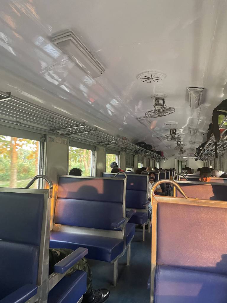 According to a sign near the middle of the aisle, the last car is reserved for monks, nuns, elderly passengers, and those with a disability. Nevertheless, the afternoon crowd is quite mixed, and half of the seats empty. Most of the passengers are dozing or looking at the scenery passing outside the rolled-down windows. Some respond to the kids waving at us from the train tracks, and others leave their seats to smoke next to the open doors on both ends of the car. Verena lets me know that she would like to listen to some music while watching the peaceful landscapes, and I do the same.