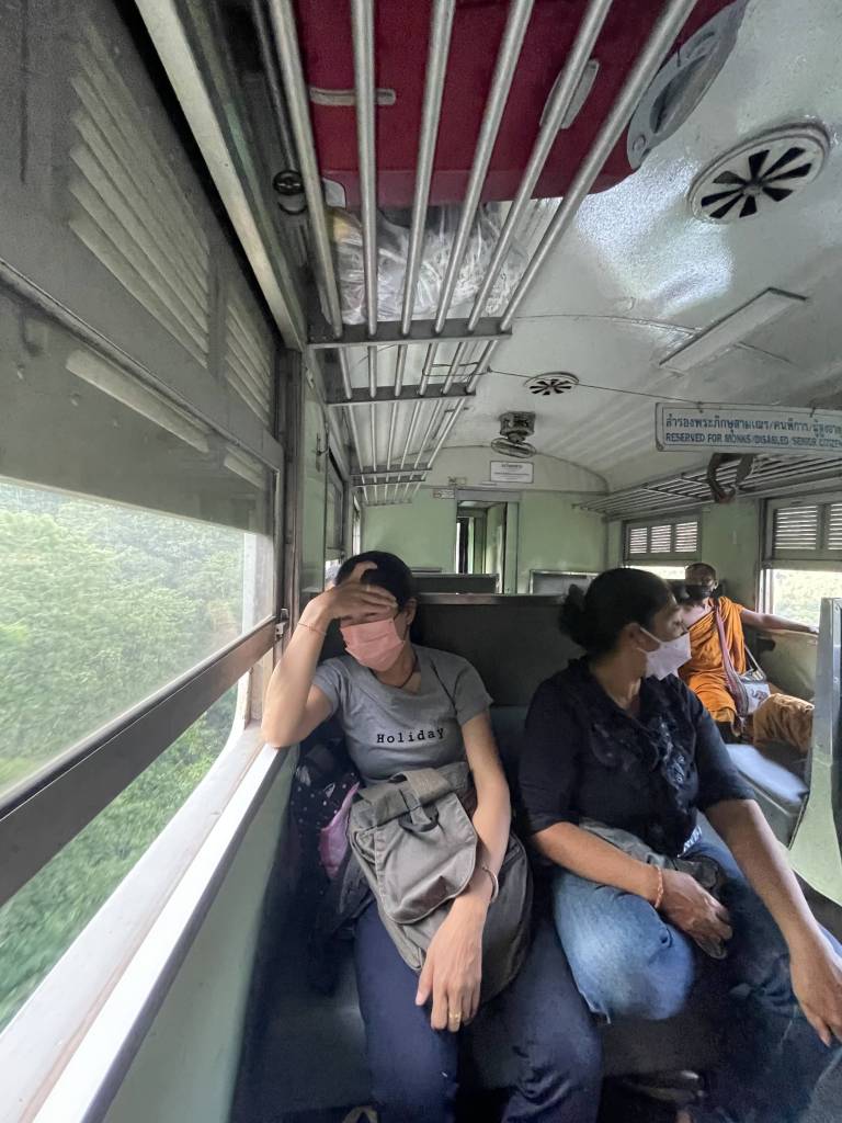 This time, our reserved seats are for the very last carriage. Since this trip takes place during COVID-19 times, all the passengers are supposed to wear face masks and expected to sit on their designated seats. However, on the outbound train, we noticed that hardly half of the seats are occupied and there is no conductor checking the 3rd class car. So we walk all the way to the end of the aisle and sit down in an empty compartment next to the rear door. There is no electricity in our car and when we enter the tunnel shortly after departing from Khun Tan, the entire carriage goes pitch black. Only when we make it out on the other side, I can have a glance at the people we are travelling with for the next hour.