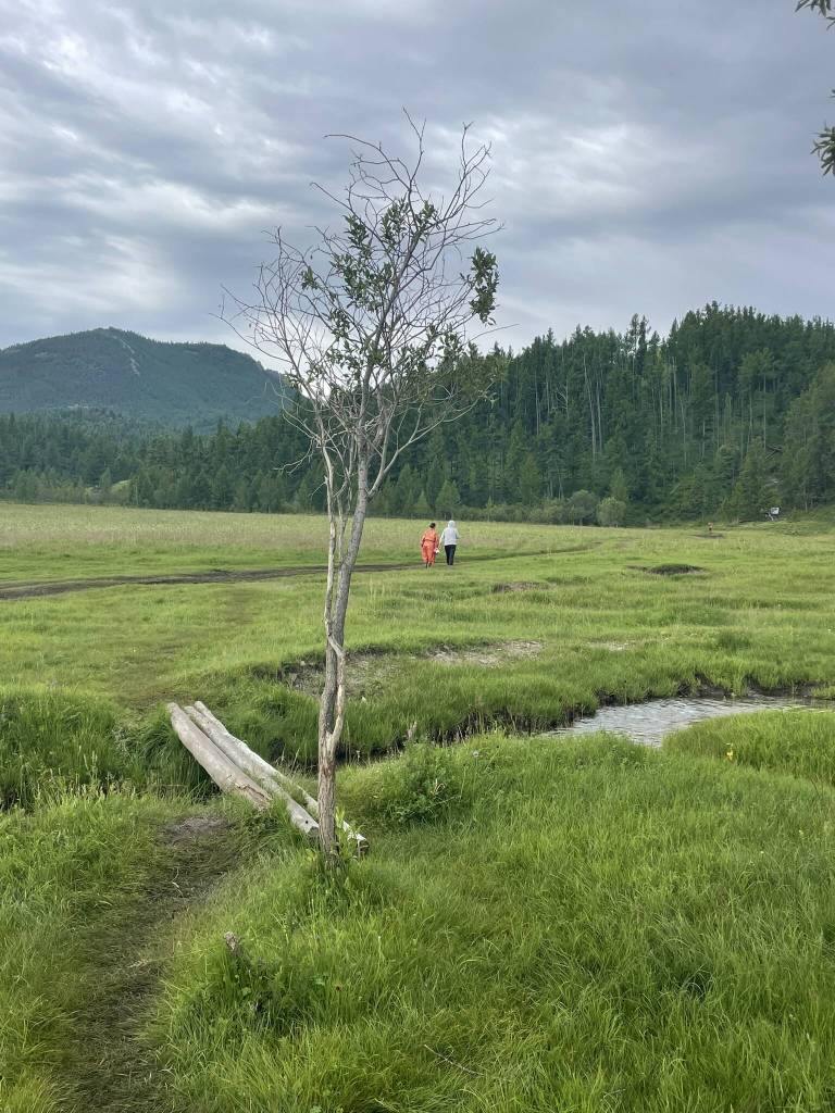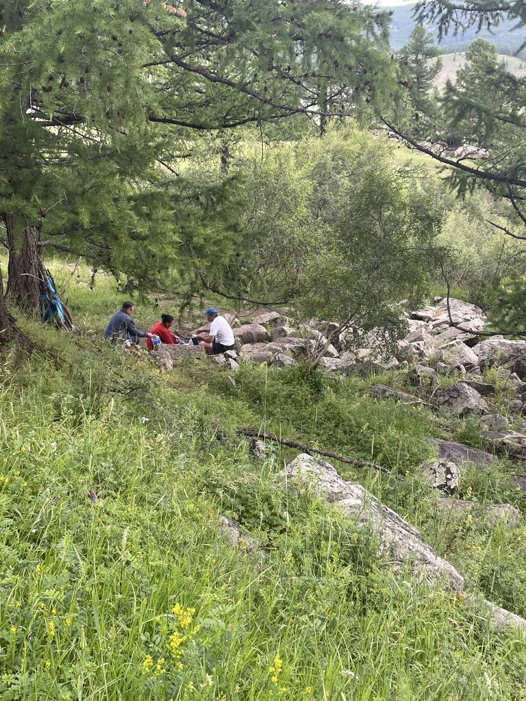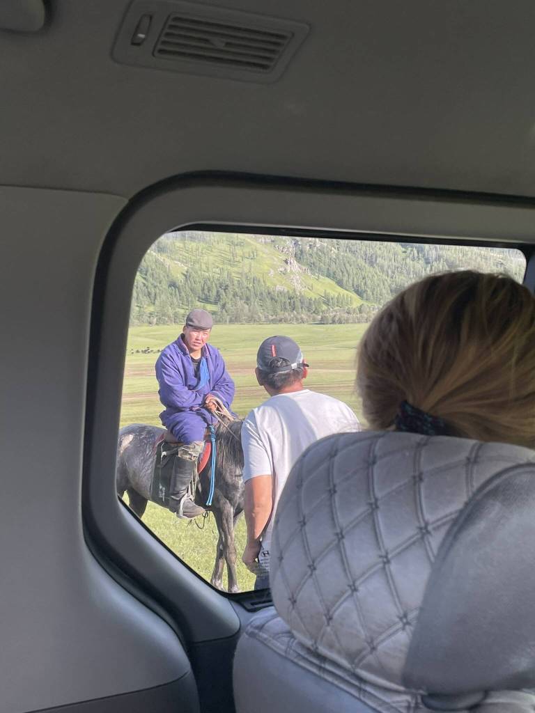 Fully loaded, we leave Tsetserleg behind and drive down the tarmac street towards Kharkorin. After about 15 minutes of the bumpless ride, we realize, that we were supposed to turn onto the field road a while ago – since that is the fastest way to the hidden spring. Unfortunately, the communication with the driver once again has to go through Google Translate, and the result is meager. We can only assume that he will be taking us to the tourist resort of Tsenkher, since that is where he usually drops of customers. Tracking our live location on Google Maps heightens this suspision. But just as we are almost giving up on the hope for another night of wild camping, the driver stops the car to greet a herdsman on a horse. They exchange a few words before the local points to the valley on our left, slightly off the way towards the hot spring resort. In good spirits, we continue to bump along the field track following a small stream.