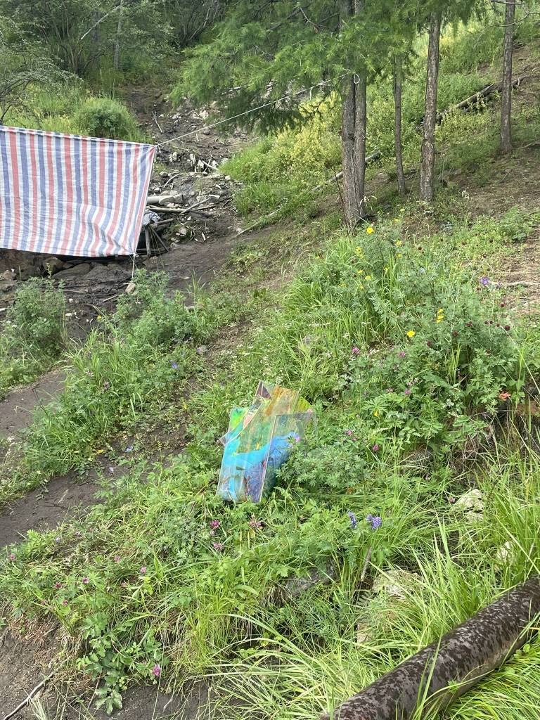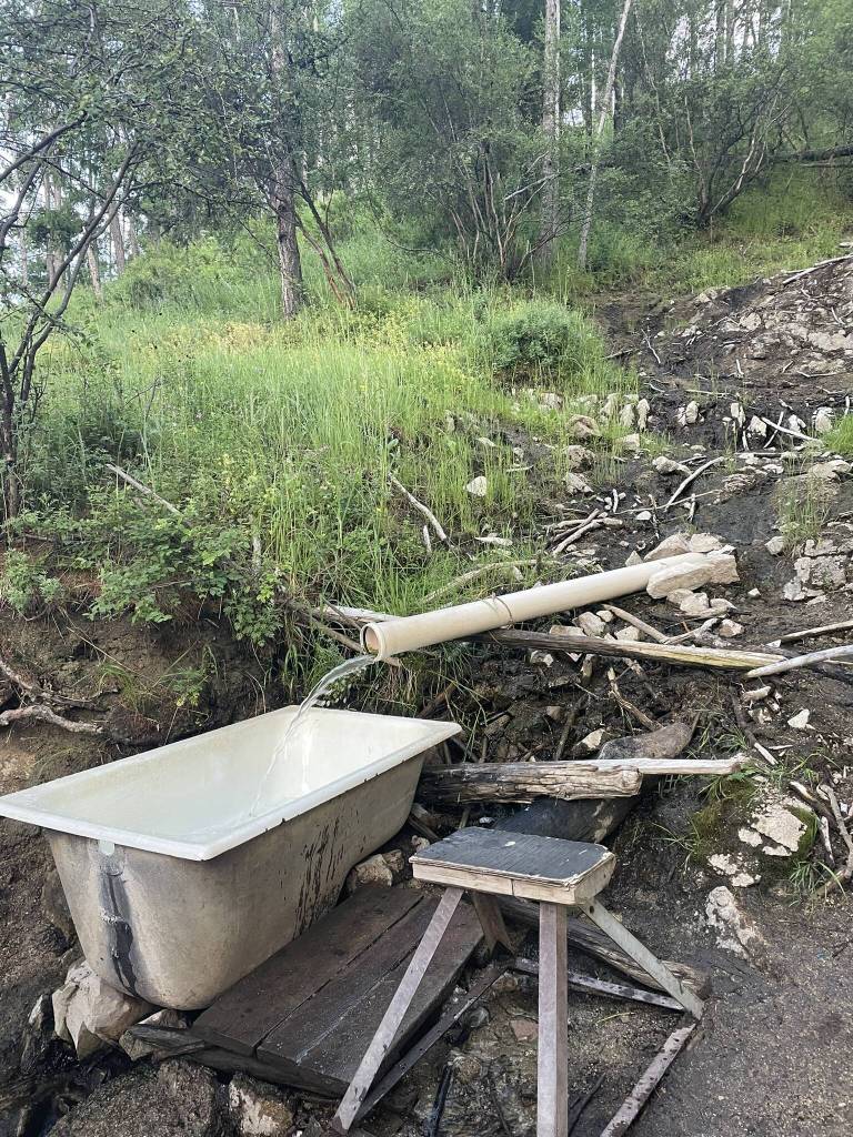 A splashing sound announces that the person behind the curtain is done and draining the tub. Shortly after we see a stream of steaming water run down the hill. A man quickly grabs his clothes from the line holding the curtain and moments later steps out fully dressed with a big smile on his face. Next, one of the ladies with wet hair disappears behind the curtain. Just when I’m wondering if they are taking multiple dips, my fellow travellers show up and we try to solve the riddle together. Luckily, another Mongolian man joining the queue hails from Ulanbaatar and speaks some English. He explains that the water here is sacred and we shouldn’t use soap to wash (given it’s a natural spring we weren’t gonna do that anyway of course). After chatting with the lady who just finished her bath, he tells us that the fresh spring water from the source near us is supposed to be good for the eyes. So people first wash their hair with cold water before rinsing their bodies in the hot spring tub.