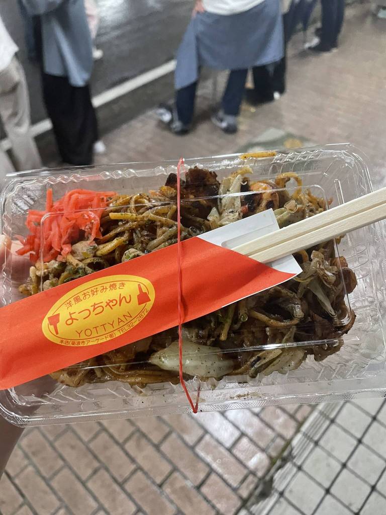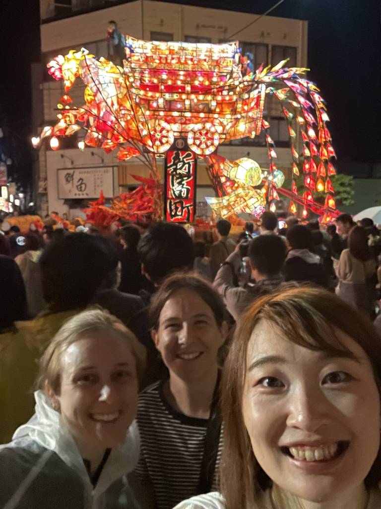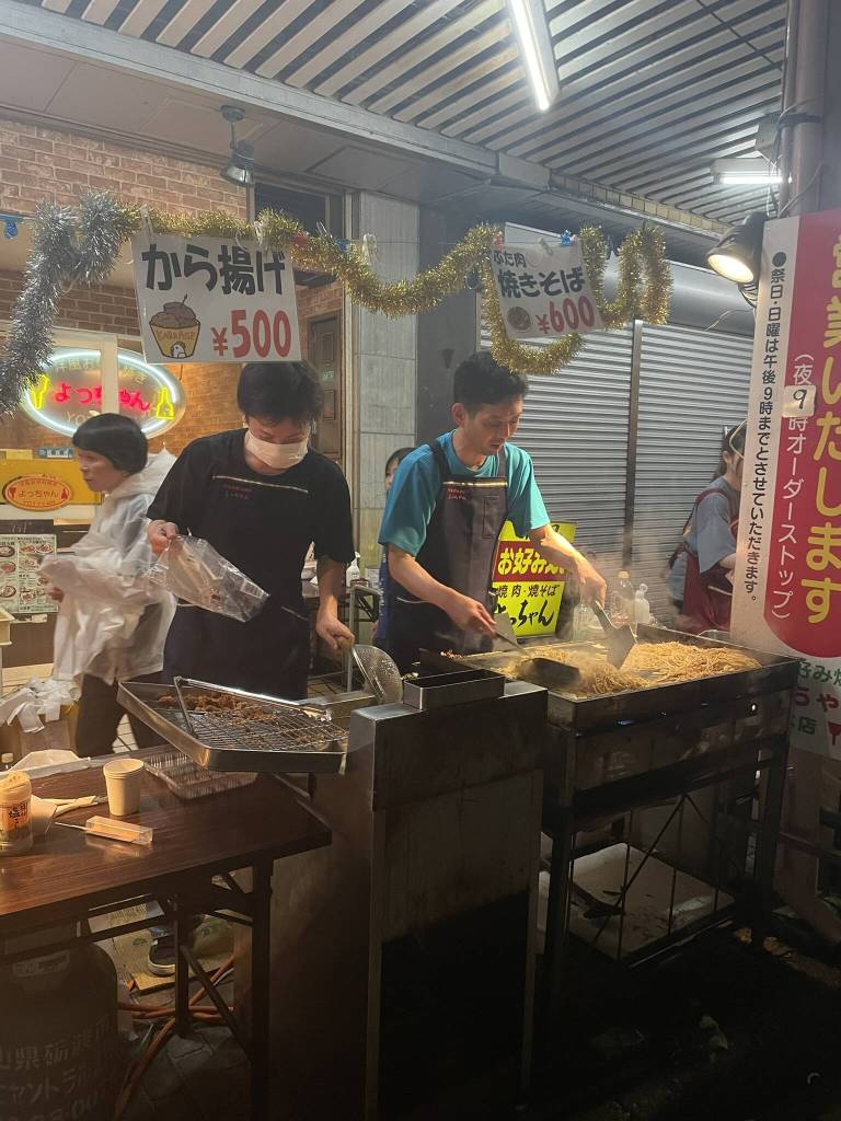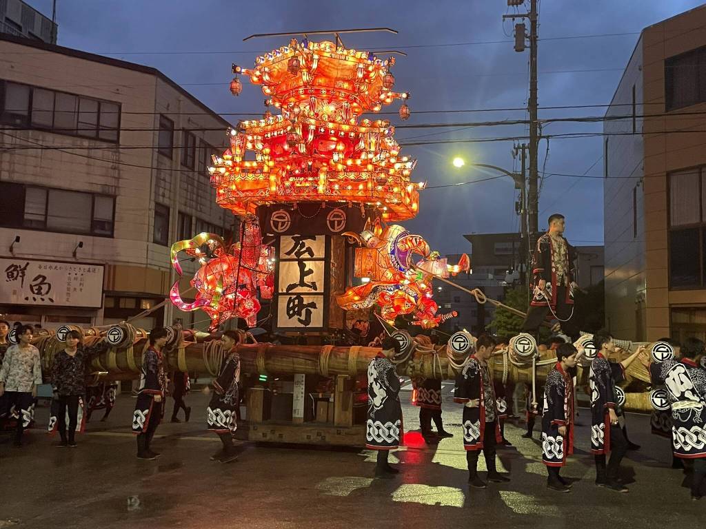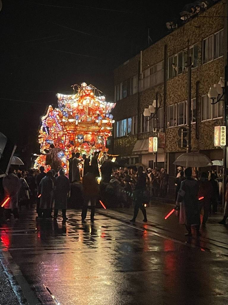 Carried and pushed through the streets by dozens of young men to the sound of drums and flutes, the floats create a powerful visual spectacle. The local pride, energy, and festive spirit of Tonami can be felt even before the main event begins. While we wait for the clash of the floats, we buy dinner at the various food stalls set up in the city. We eat our yakisoba and karaage chicken under an arcade covering the shopping street, which protects us from the rain. There are lots of musicians, elders, and local community members who join as onlookers like us or to support the young men by delivering food and drinks.