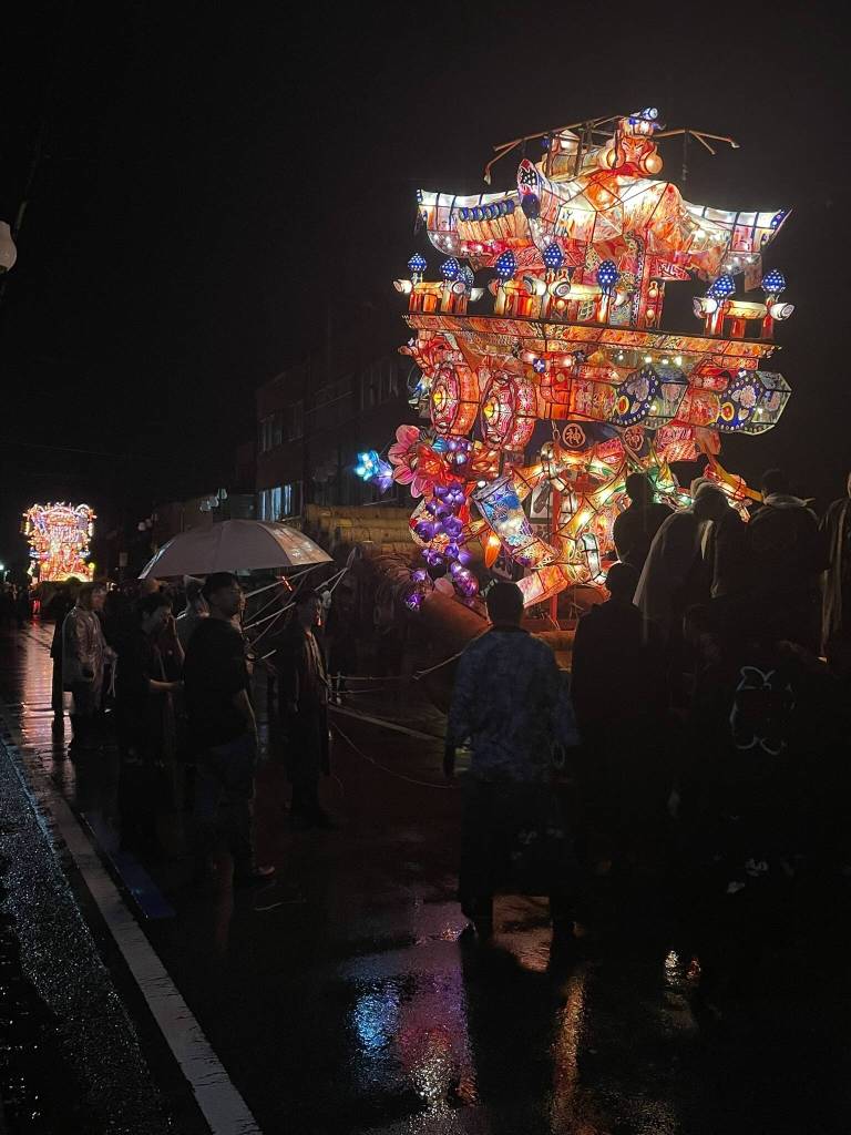 Finally, the increasing sound of drums & flutes announce the start of the main event. We head back to the main crossing, where a sea of transparent umbrellas blurs out the lit-up floats. Security guards (& ropes) are preventing onlookers from walking out into the road, which could be very dangerous. 2 colourful floats are already pulled back by their builders. They are ready for the festival’s peak: now teams will deliberately ram their massive lantern floats into one another in a spirited display of strength, coordination, and courage. After a bit of readjusting, the foreman standing on top of the structures counts to three. This is the signal for the rest of the group below to push and pull the floats to the center point with as much force as they can. As far as I can tell, the goal is to damage the other float. This is likely also the reason the rain doesn’t stop the event from happening, unlike other festivals, where the floats are to be protected at all costs.