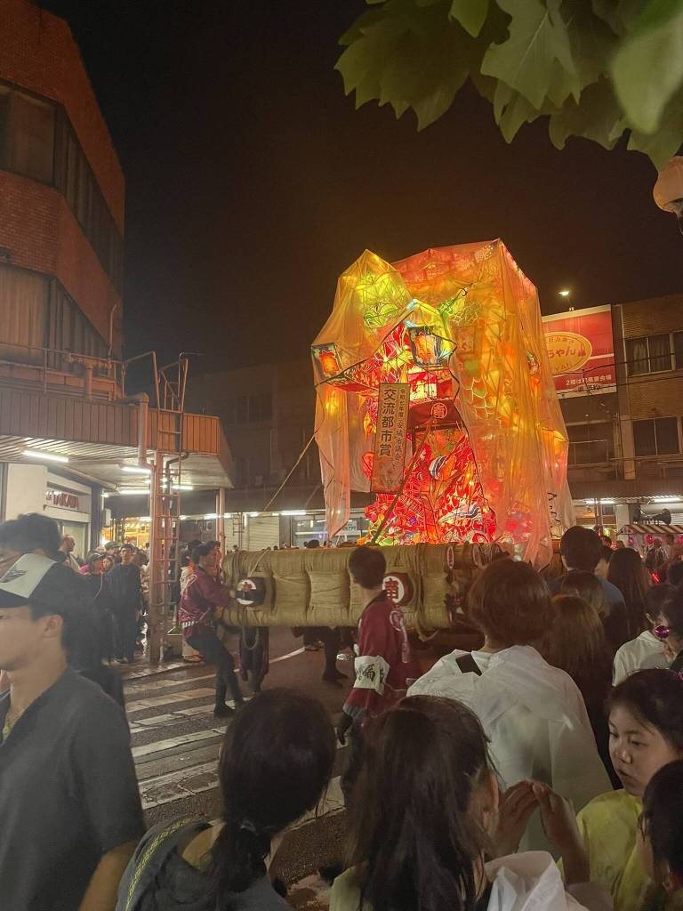 When the lanterns finally crash into each other, the participants rock them back and forth a few times, which is accompanied by a lot of supportive chanting from the crowd. I find myself conflicted between cheering on the guys who are clearly having a lot of fun doing this, and feeling bad about the beautiful floats getting destroyed in the process. At least it seems that none of the lanterns are too badly damaged after the fights, and all participants stay safe. When the last floats finish their fights, we get another chance at looking at them from close up as they return retrace their way through Tonami’s streets. Only then I realize that there are even people standing on top of some structures. This is definitely one of the more unique festivals I’ve been to in Japan.