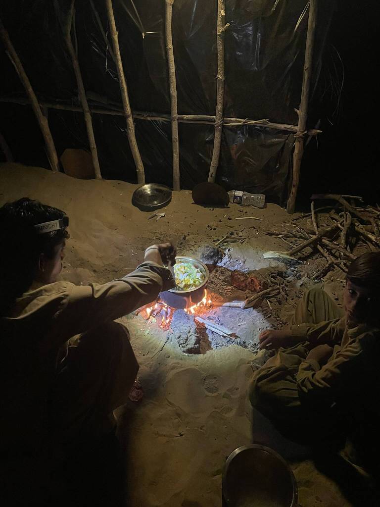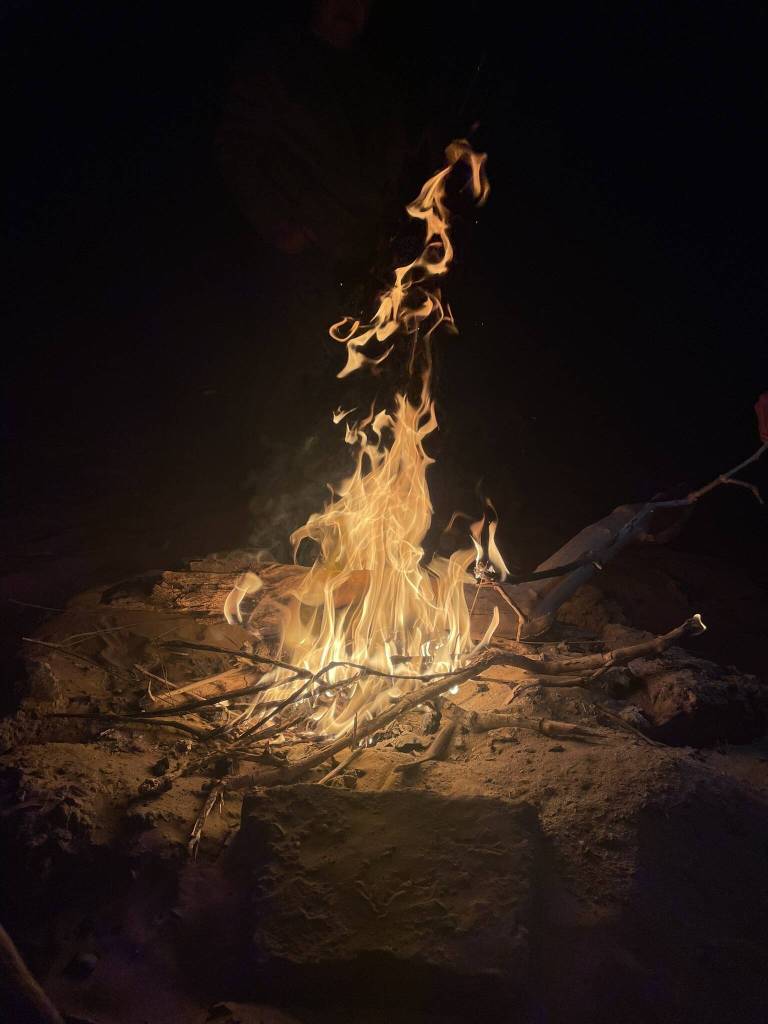 While we chatter away, the camel driver, his son and other male relatives are busy preparing dinner. Over a small bonfire, a vegetables are simmering in a large pot. It’s getting dark quickly and in an attempt to be of any help, I offer my headlamp to the young boy stirring the stew. Looking for other forms of entertainment while waiting for dinner to be ready, Akira, Andy and I busy ourselves with making a second bonfire to sit around. We light branches of the dry bushes dotting the landscape at the cooking fire and transfer the flame to smaller sticks at the fire pit in the eating area. By now, the temperature has already dropped significantly, and everyone scooches a little closer on the blankets surrounding the fire. Then the food is served and we warm ourselves with multiple servings of vegetable stew, rice and fresh roti. Some of the village men also sit with us and everyone is asked about their home country.