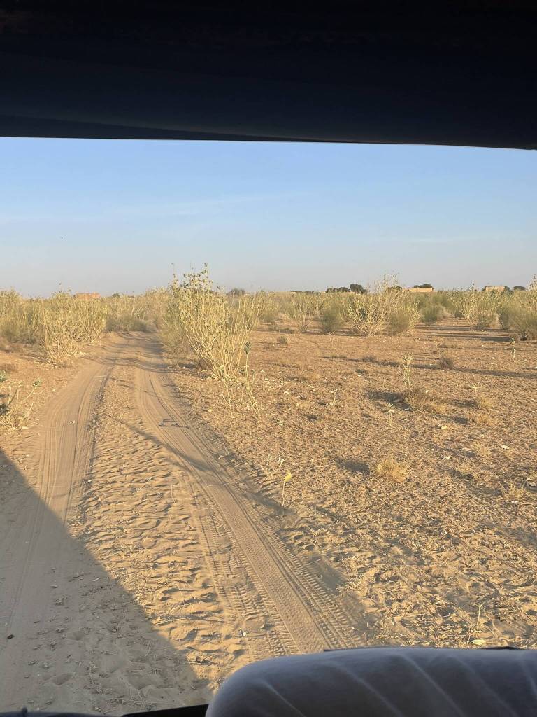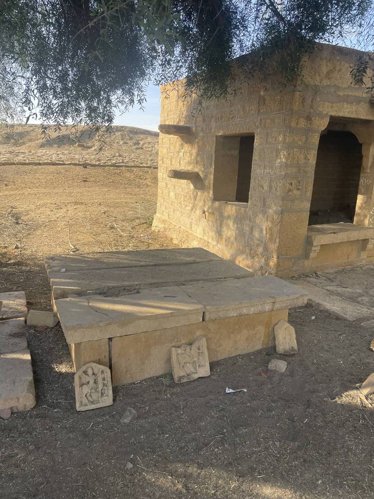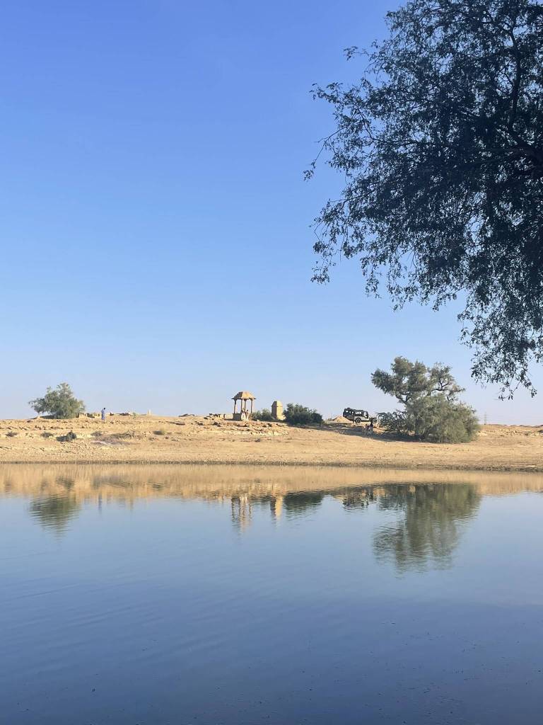 With this entertainment, the 65 km drive into the Thar desert simply flies by. We soon leave the city behind and after kilometers of well-maintained highway roads, pass through small villages, where kids are on the way back home from school. When the driver stops at an ATM, a few of them run up to the jeep. While we are prepared for the usual enquiry about chocolate, the boy asking for “10 Dollars” rather than “10 Rupees” takes us a little aback. We pay them off with candy, and then, our drive continues towards the India-Pakistan border. Of course, we don’t go quite that far today. Our final destination lays just a little north from the Sam sand dunes. But before we can take in the sunset there, we stop at a slightly underwhelming oasis and a ghost village. The highlight of the first place are the relicts of a temple that we find half buried in the sand. The ghost village mostly consists of random piles of bricks and a fort that the driver says is closed, but there are still people walking on its outer walls.