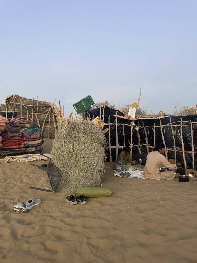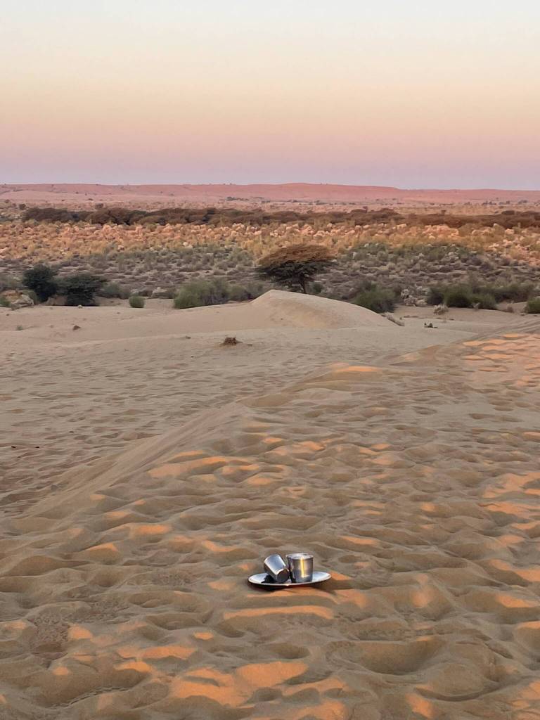 Luckily, the mood is soon lightened again when I spot the first shooting star. It brings us back to Andy’s area of expertise (mathematics) and we try to come up with creative ways to calculate the probability for all of us to see more of them. Those stupid hypothetical conversations where none of the participants take themselves too seriously are honestly my favorite. Wrapped in layers of shawls and scarves, we spread out on our blankets in the sand and lay on our backs looking up into the night sky. With little to no light pollution in the area, star constellations are clearly visible, and I spot one shooting star after another. At one point I stop counting and bundled up under my weighted blanket, fall asleep soundly. I wake up just before sunrise and see that Andy is already up, walking around the dunes. Wanting some peace and quiet, I grab my sandals and opt for another sandy hill facing east. But it’s only a short while before the rest of the group joins us, including the desert dwellers who serve us freshly brewed chai.