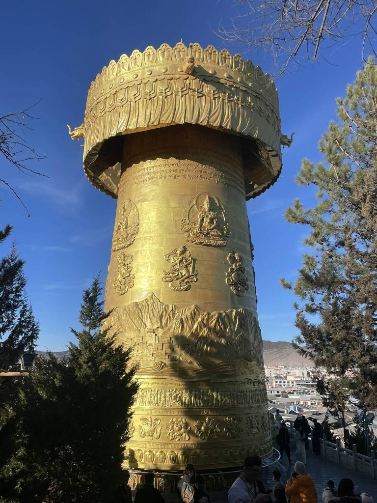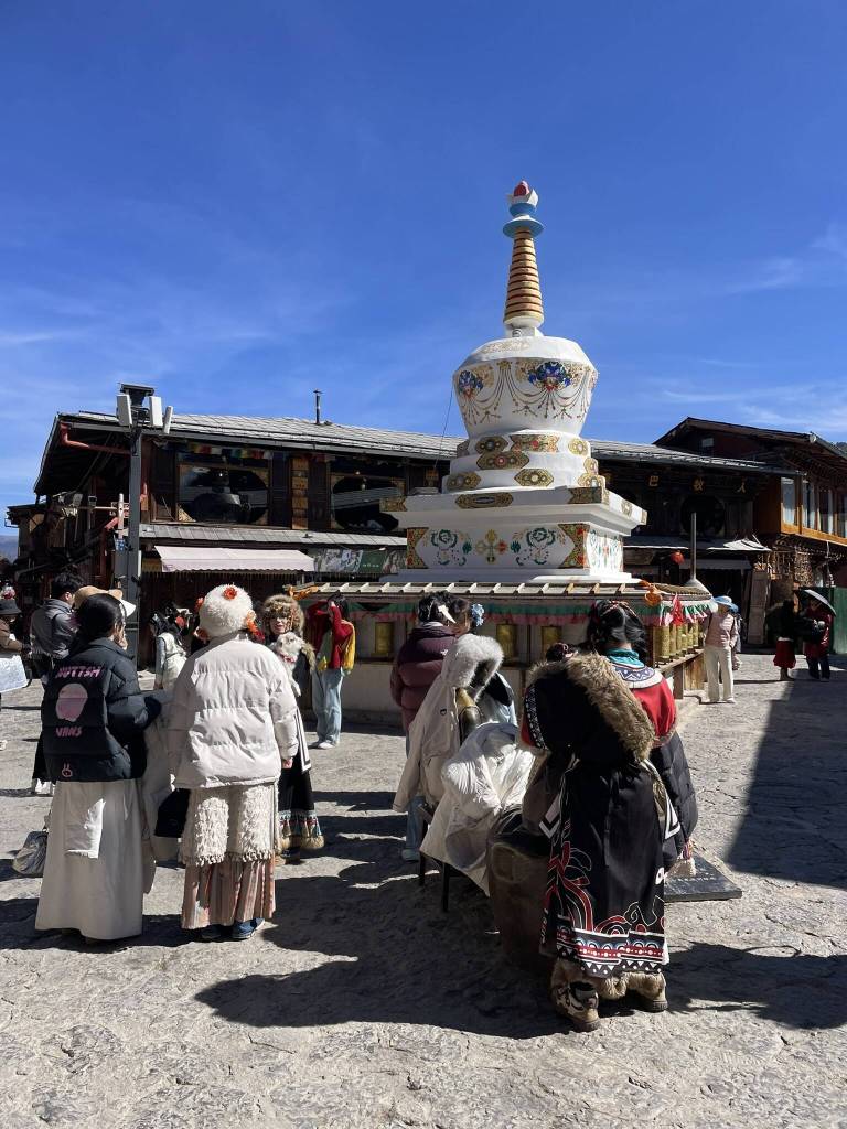 One welcome side effect is that the name attracts large numbers of domestic and international tourists. They spend their money on Tibetan handicrafts, yak products, and photo shoots in traditional attire. Tourism may help keep some traditions alive — such as the daily evening dances on the town’s “Dancing Square”. And the giant prayer wheel installed on Turtle Hill may raise awareness of Tibetan Buddhism and its symbolism (though, realistically, it often only serves as a backdrop for photos and livestreams). The downside of the tourism boom is the influx of business opportunists from all over the country. Making it increasingly difficult to find authentic goods, food, and accommodation. Still, I managed to find a cozy guesthouse in a traditional Tibetan farmhouse in the old town, as well as a few spots offering delicious meals and much-needed hot chocolate.