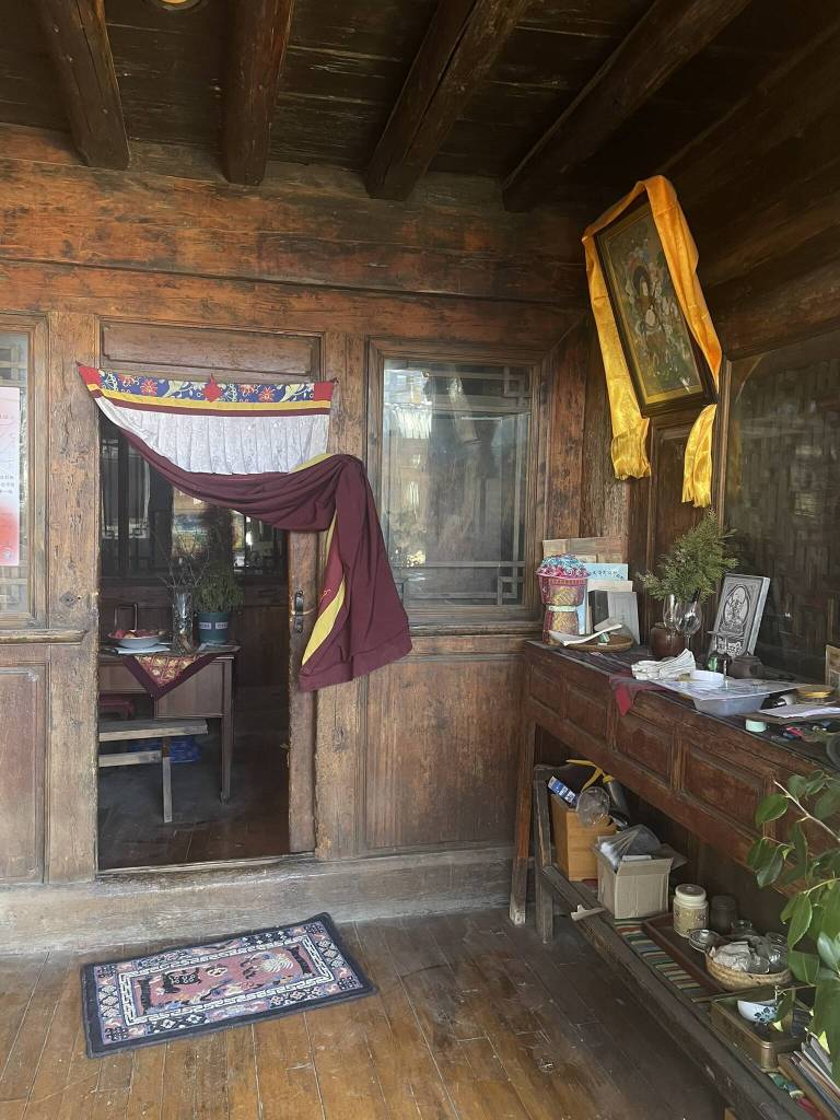These traditional houses are built entirely of wood. The ground floor was originally used to shelter animals such as goats, sheep, and yaks, while the upper floor served as living space for the family. Without central heating, people would gather around the fireplace in the kitchen-living area. This construction style and heating method were also the reason why, in 2014, a fire spread rapidly and destroyed around 300 buildings in the old town. Much of this, and more, I learned by talking to locals. Without asking too directly, not wanting to put anyone at risk for speaking their mind, I tried to get a sense of what life is like here today. Many spoke English well. A recurring concern people mentioned was education. One person had been sent abroad by their parents at a young age and only returned to Shangri-La upon graduating from university. After working locally as a teacher for some time, they eventually lost the ability to continue doing so due to political circumstances.