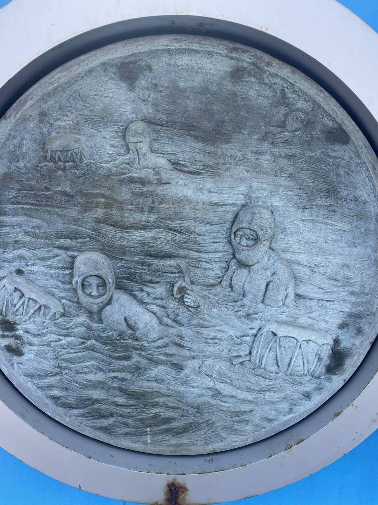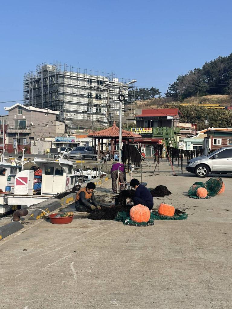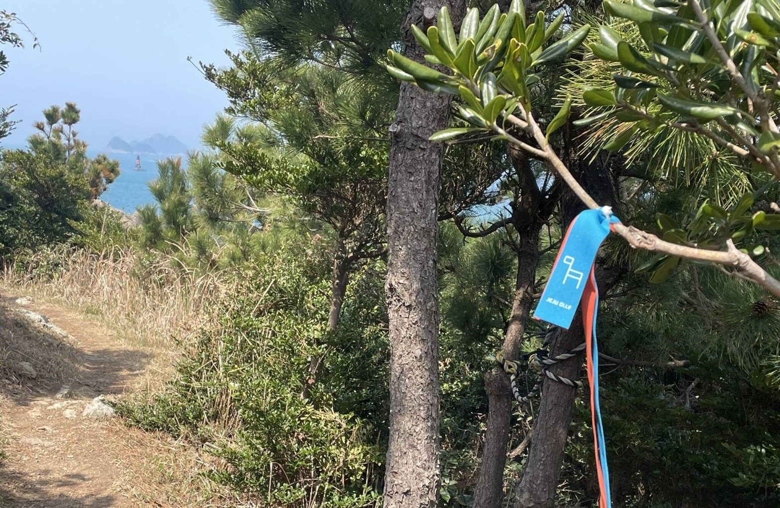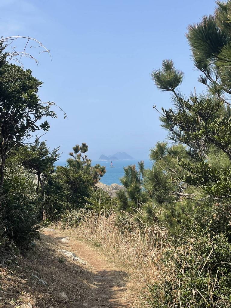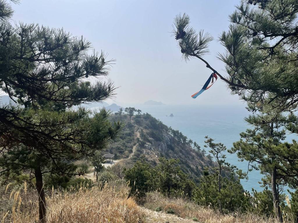 The view from the top on the quiet fishing village is the immediate gratification I need to continue the climb up on a forest path. Here I meet the first other hikers of the day. In general, the trail is more crowded than what I remember from other sections in Jeju. Granted, it is a sunny Saturday in early spring; perfect conditions for a hiking day by all means. I take a first break at the Chujado lighthouse to take in the magnificent views of the bright blue sea blending into the sky at the horizon. It’s a popular rest spot where people slow down after the first ascend, make use of the toilet facilities or take a look at the small art installation depicting the island’s main industry: fishing of all kinds. Deep sea on boats, from the shore, and through freediving. I don’t linger long, after all I still have around 18 kilometers to go. And from what I can see of the southern island now, more ups and downs are expecting me. I continue to follow the blue and orange ribbons down the hill and soon cross the bridge to the southern island. There, a group of older women are chanting along with a buddhist monk at the seaside.