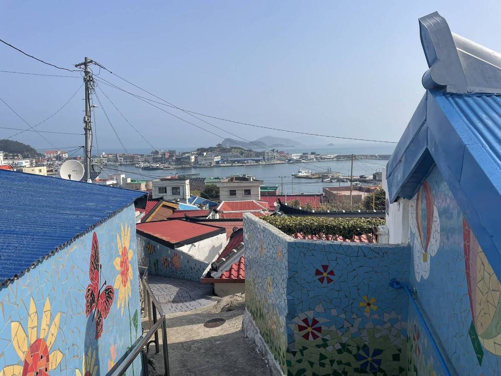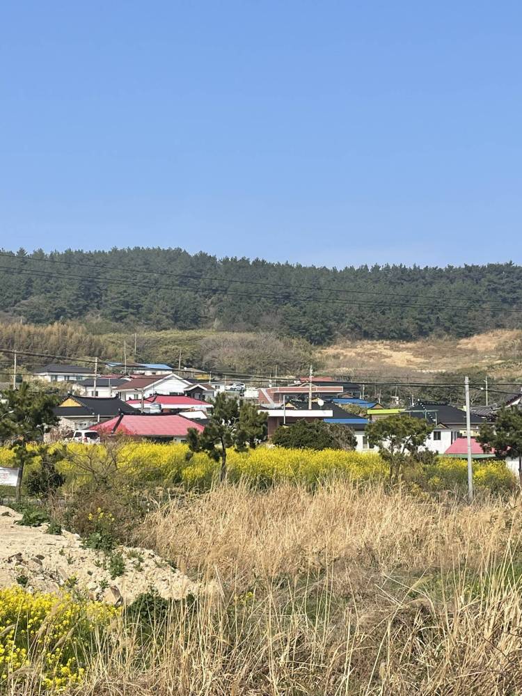 I pass through the small fishing village of Yecho, where I find colourful mural paintings and the first bright yellow canola blooming. From here on, I cross a couple of groups of hikers coming from the opposite directioin. Likely having taken the bus from Sangchuja Port to Hachuja, walking north on trail 18-1, skipping number 18-2. That way, a visit to Chujado could easily be shortened into a day trip. But I’m determined to do both. So I continue on the coastal trail, wishing I bought my lunch back at the convenience store in Sangchuja, so I could enjoy the views here with a meal. I still rest in a couple of pretty spots, keeping myself hydrated and recovering from yet another climb up one of the countless hills. Luckily port village on the southern end of the islands is coming into view soon and I’m checking my Kakao Map for a shop to buy some gimbap. However, the only one available is a small local convenience store. The products on offer include a selection of cup noodles, potato chips, cookies and lots of bottled coffee. So a vanilla latte and a bag of corn chips have to give me enough energy to return to Sangchuja.