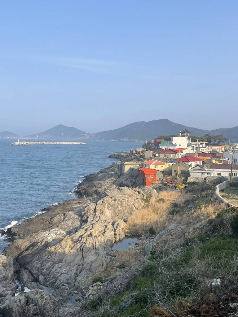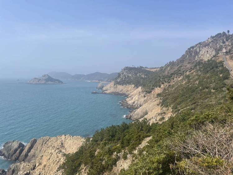 I eat my “lunch” on a small bench outside the town center before fighting another urge to cut the hike shorter by skipping Daewangsan View Point. Now, I don’t see any other hikers on the trail anymore. Most must have stopped for lunch somewhere along the way, or already taken a bus back north. So it’s completely up to me to motivate myself. I finally pull myself together and soon reach Yongdumbeong. Fueled by the coffee’s sugar and incredible views of the cliffs and small islands in the distance, I even master the long stairs up to another viewpoint. From here, the rest of the trail is slightly flatter. First leading through the cute village of Mukri, where I see a man re-painting the roof of his house in bright orange, and a black cat mischeviously sneaking around a Haenyeo’s basket. Then I continue on countryside roads, fields and a narrow forest trail, until I’m back at the small bridge connecting the southern and the northern islands. That means it’s only about 30 minutes along the main coastal road back to Sangchuja Port. Along the was I stop one last time to enjoy the peaceful seaside.